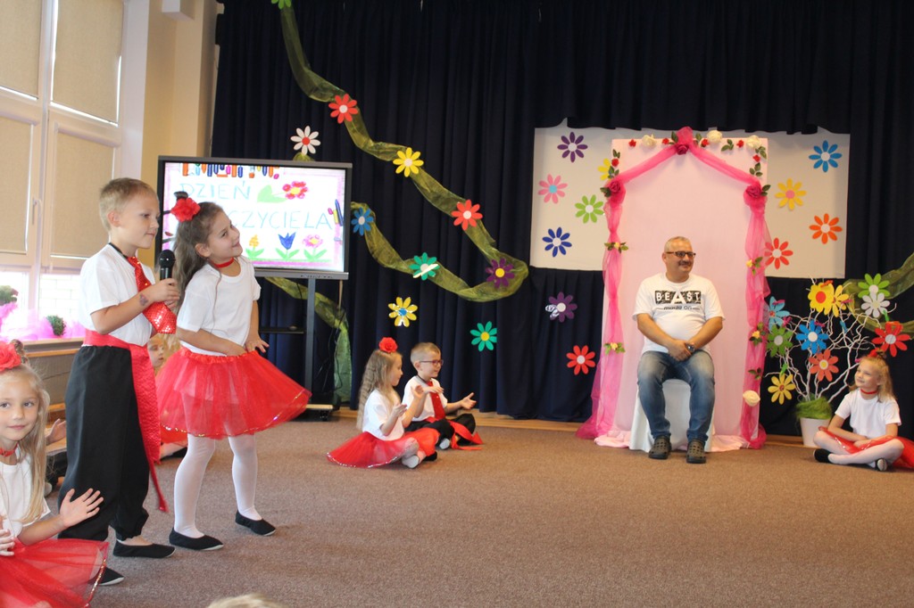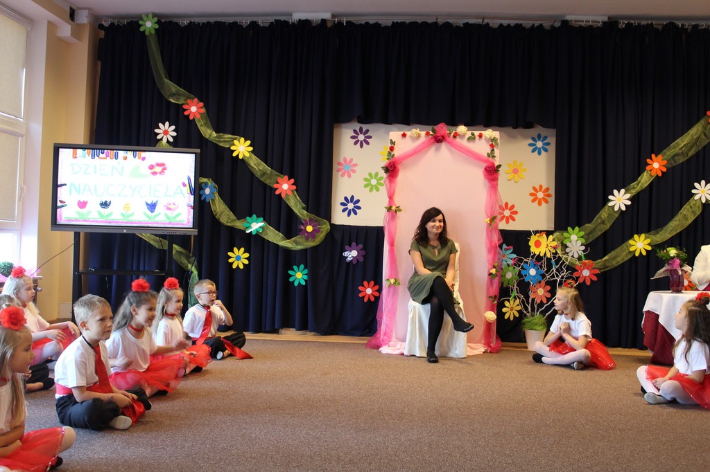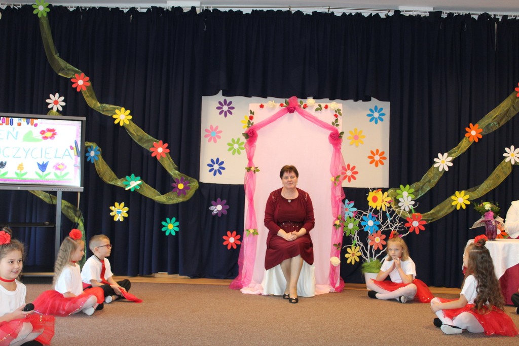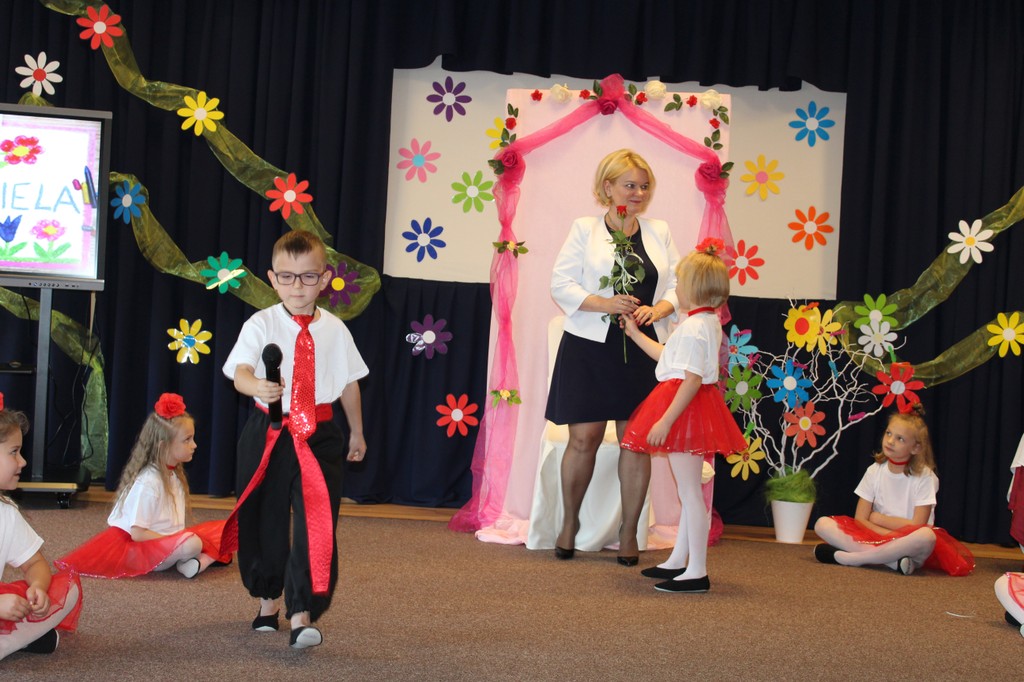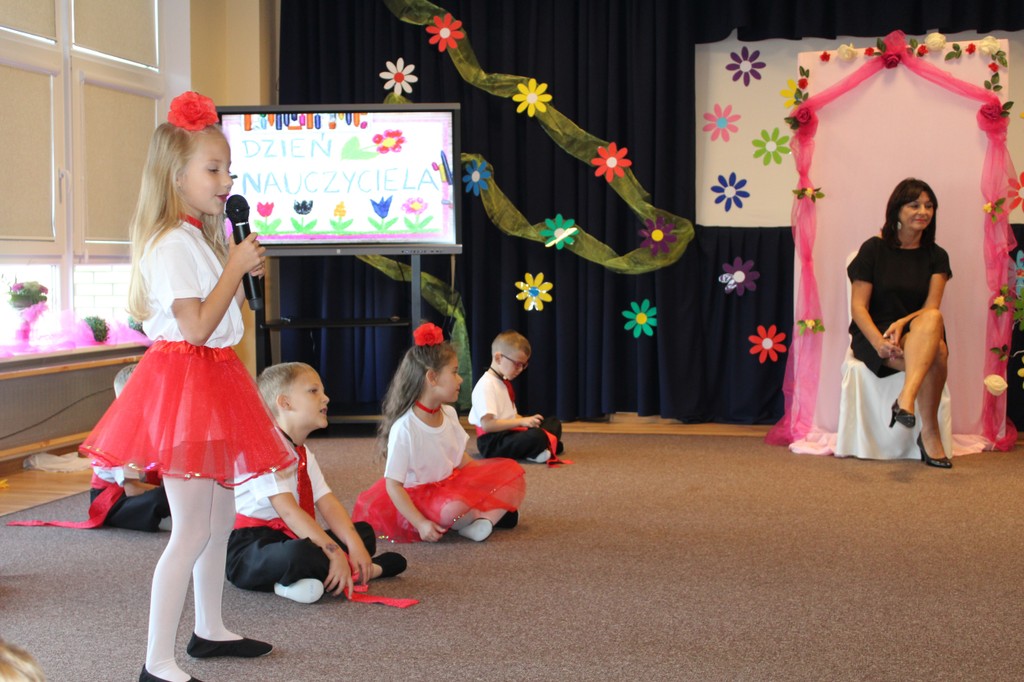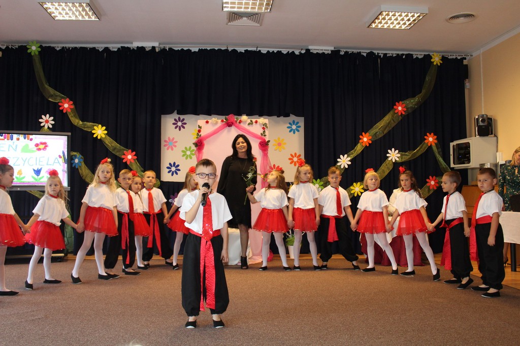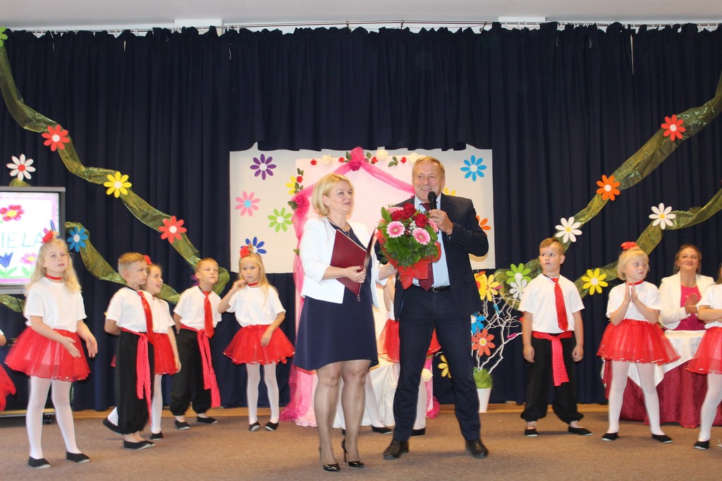 które specjalnie przygotowały na tę okazję występy. Przedszkolaki zaprezentowały " Koncert życzeń " ze specjalną dedykacją i piosenką dla każdego pracownika. Niespodzianka wywołała zachwyt, zaskoczenie i wzruszenie. Dzieci były bardzo dumne i pełne powagi podczas artystycznego wystąpienia. Sześciolatki otrzymały wielkie brawa. Pani Dyrektor i Burmistrz złożyli pracownikom przedszkola ciepłe życzenia radości i sił, których z pewnością nie zabraknie nam na kolejne miesiące. Dopełnieniem tej szczególnej uroczystości były róże i poczęstunek, który sponsorowany był przez Radę Rodziców. Za co serdecznie dziękujemy.