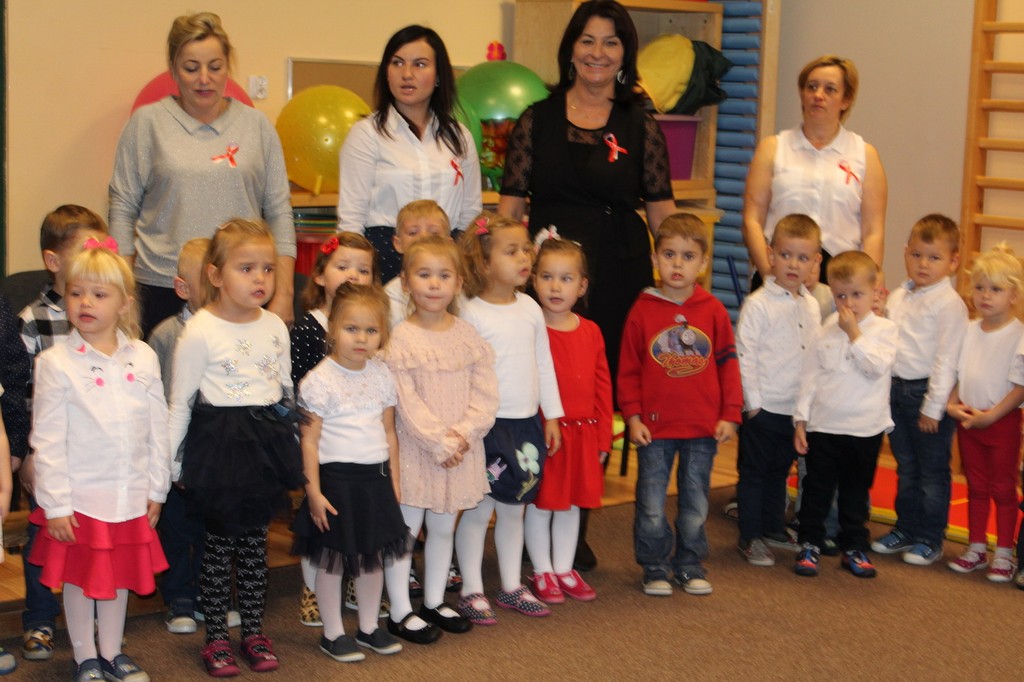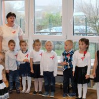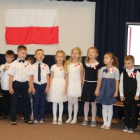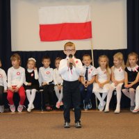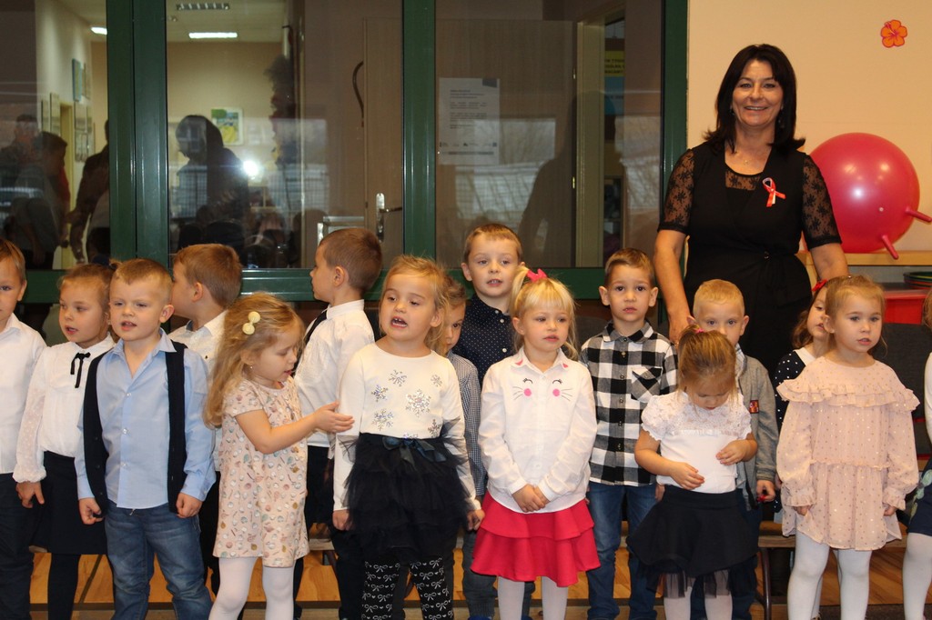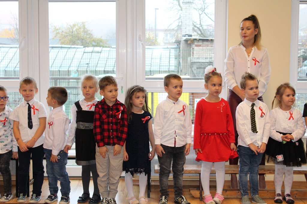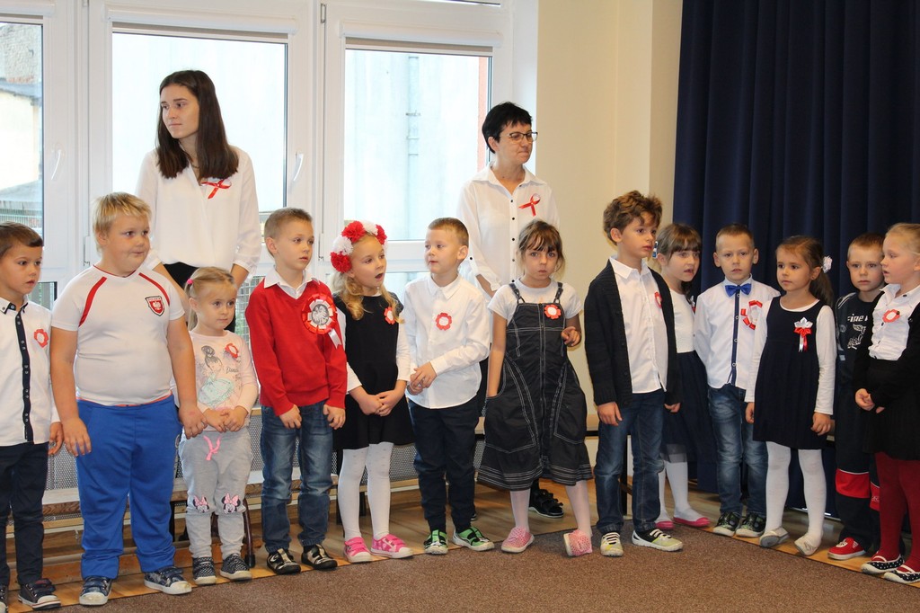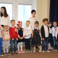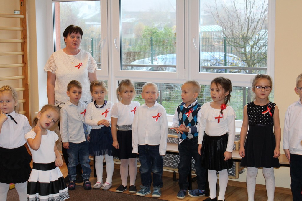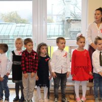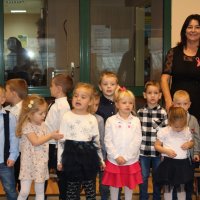 Na początku wszyscy wspólnie odśpiewaliśmy hymn narodowy. Każda grupa przygotowała na tę uroczystość kotyliony w barwach ojczystych. Przedszkolaki słowem i piosenką oddały szacunek symbolom narodowym.
