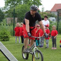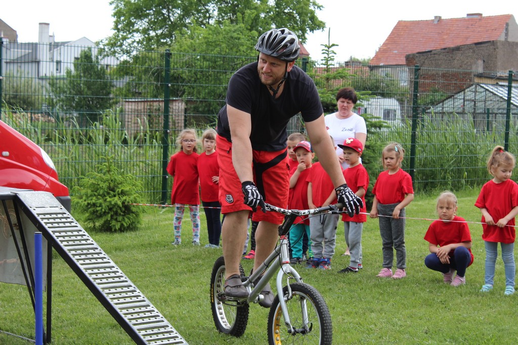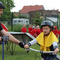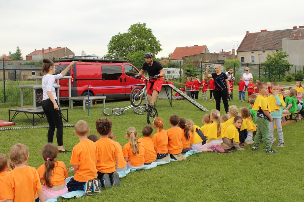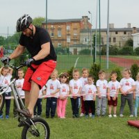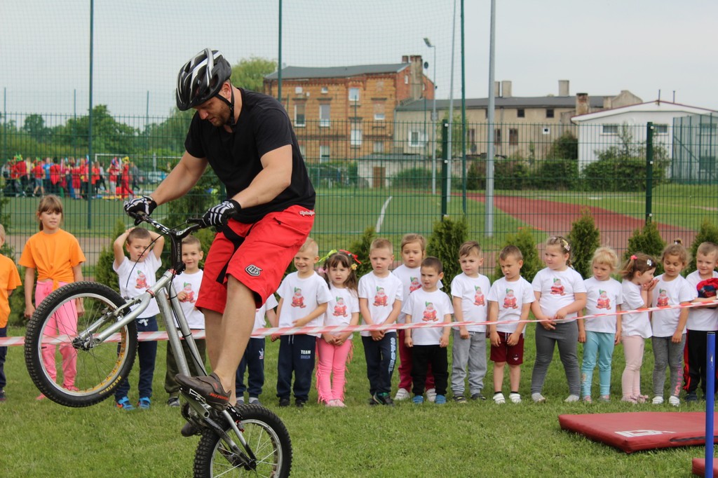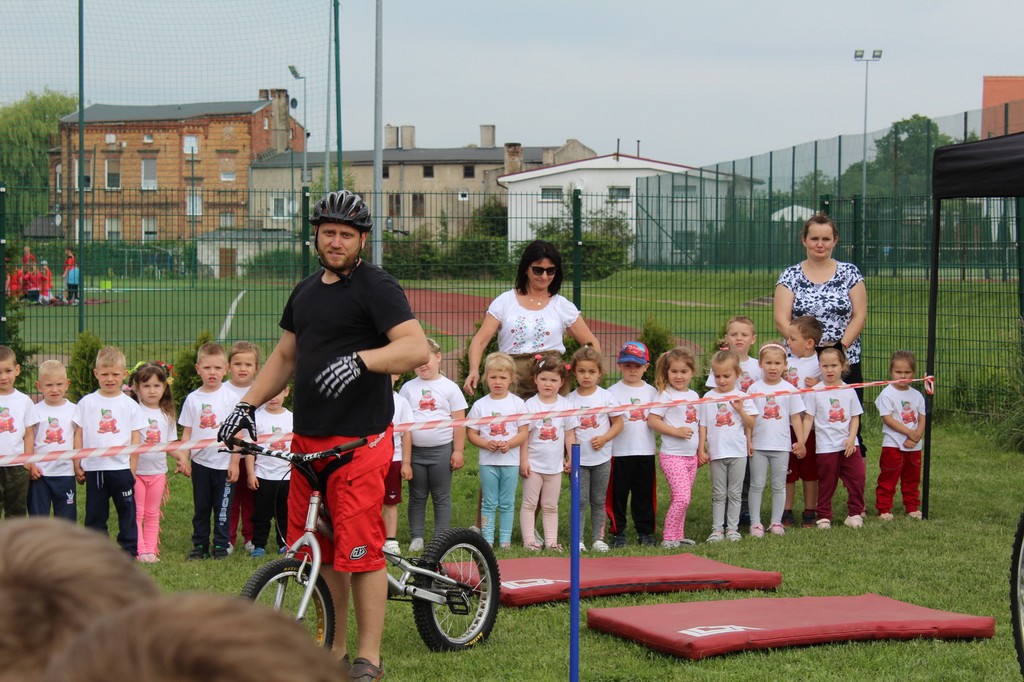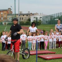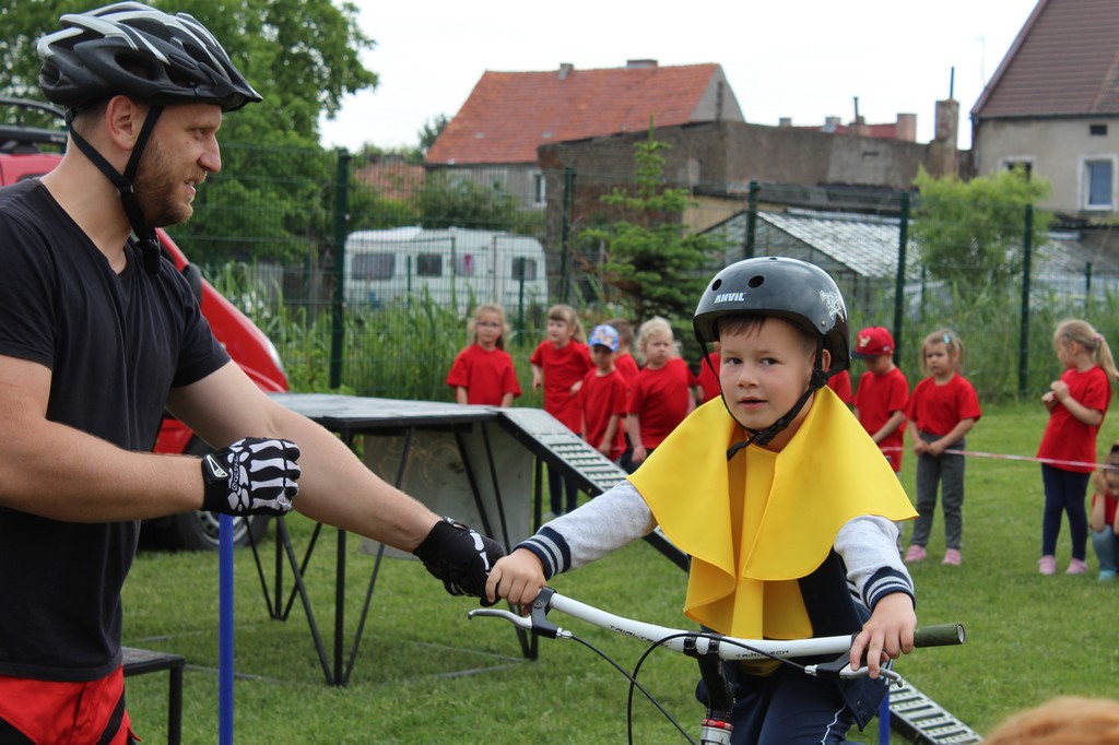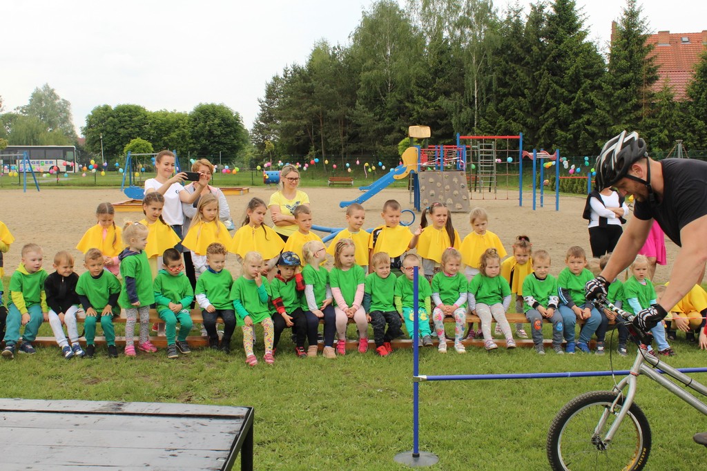 pokaz trialu rowerowego w wykonaniu pana Mateusza Kowalczyka. Instruktor zaangażował chętne dzieci do jazdy na rowerze. Dzieci brały udział w zawodach sportowych w swoich grupach. W formie zabawy ćwiczyły sprawność ruchową, uczyły się zdrowej rywalizacji, przestrzegania zasad fair- play oraz radzenia sobie z porażkami. W trakcie imprezy dzieci zajadały się kiełbaską z grilla popijając sokiem. Wszystkim dzieciom wręczono dyplomy.