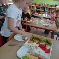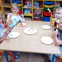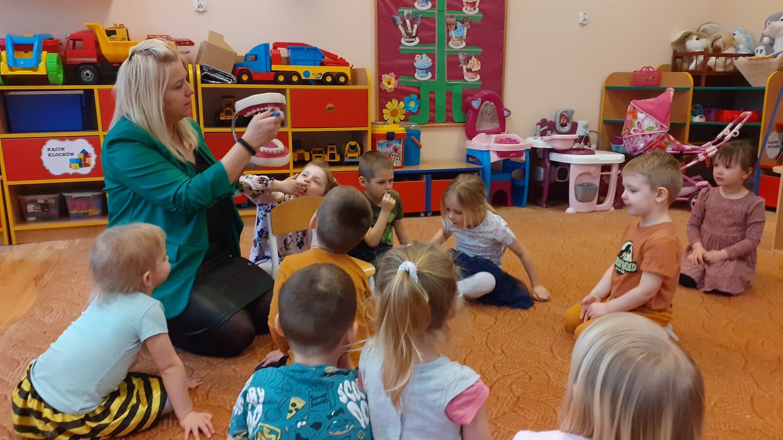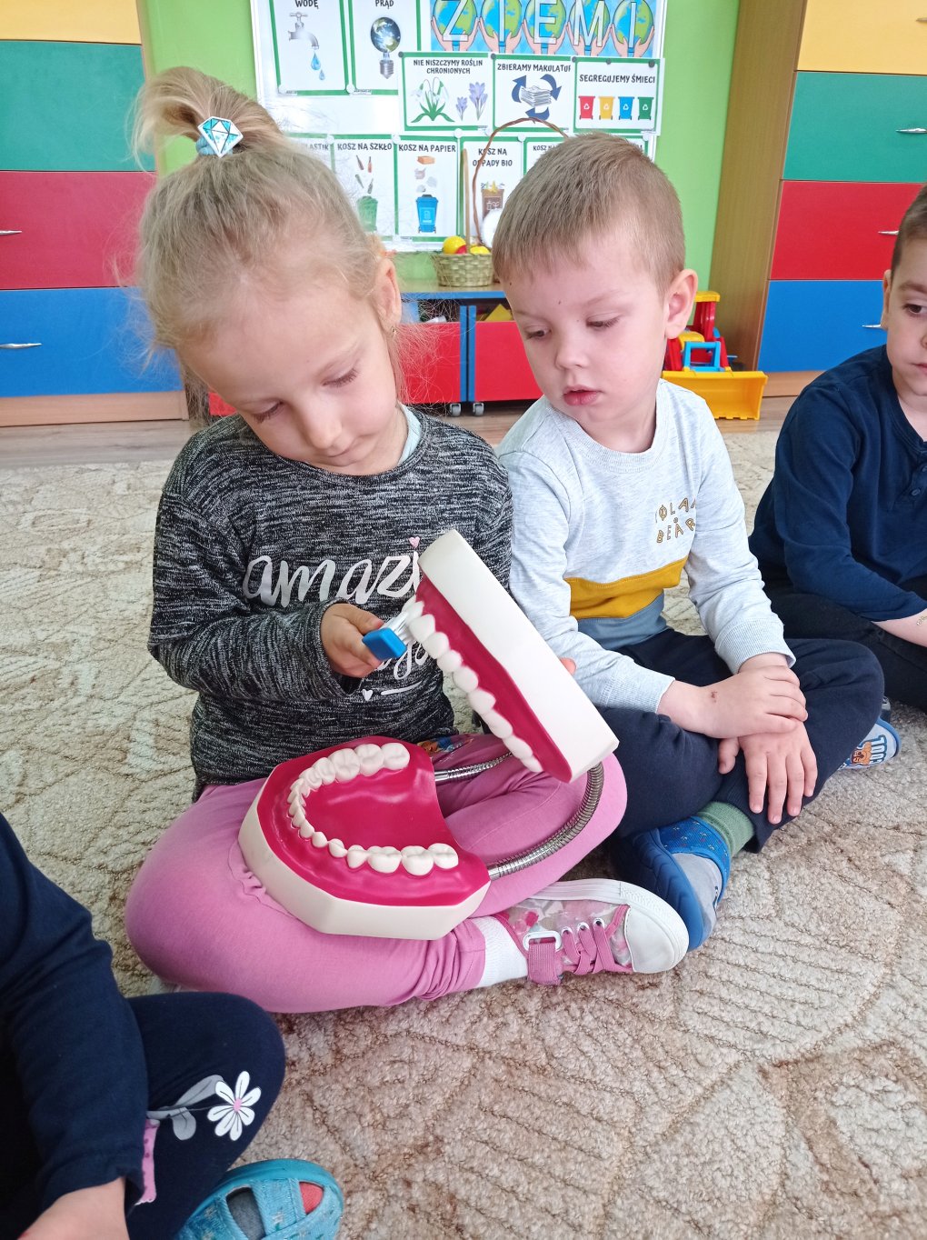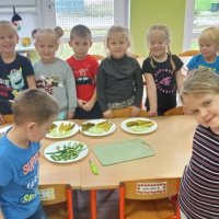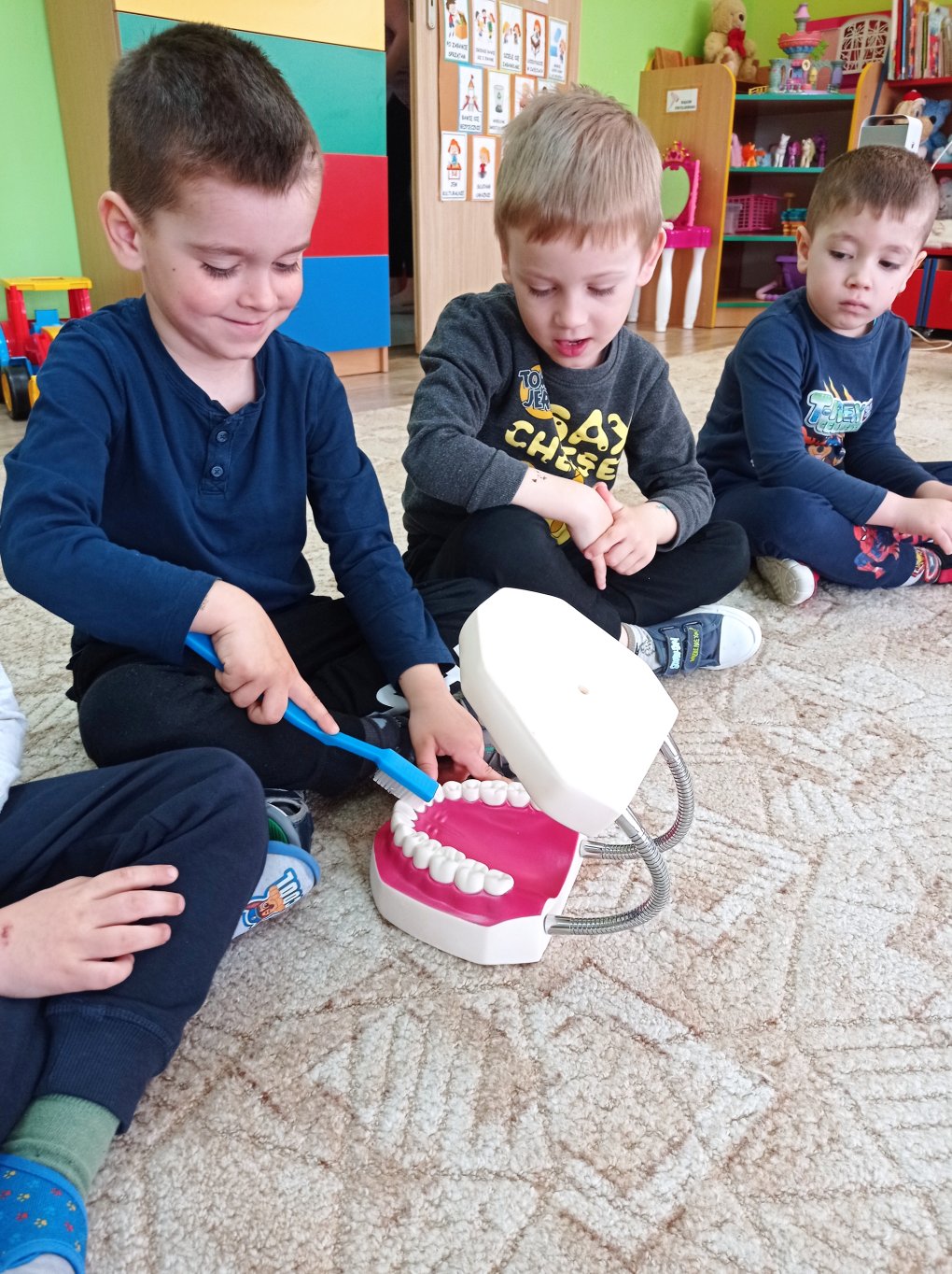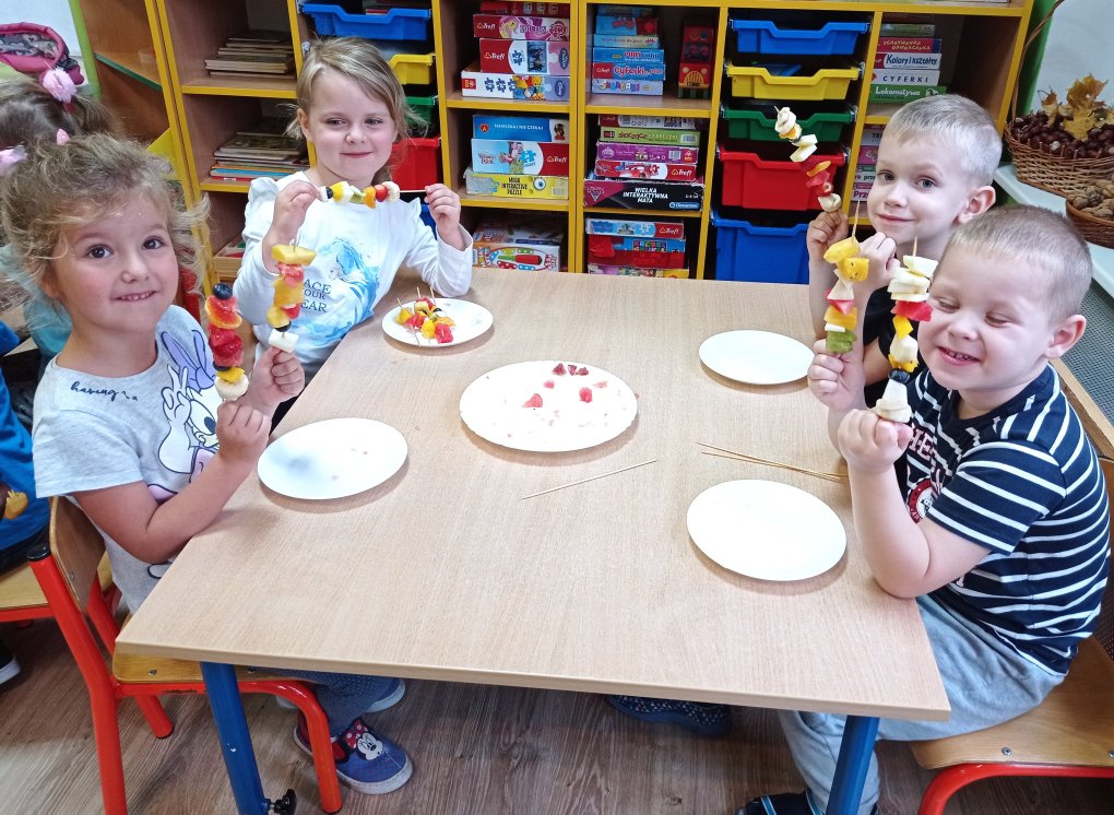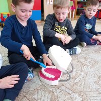 Podczas realizacji pierwszego tematu: „Zdrowe ząbki i piękny uśmiech” dzieci poznały model ludzkiej szczęki oraz przypomniały sobie i utrwaliły zasady prawidłowego szczotkowania ząbków. Rozmawiały o przyborach higienicznych, kolorowały obrazek zdrowego ząbka, wysłuchały opowiadania pt. „Benio u dentysty” i rozmawiały na jego temat. Realizując drugi temat: „Co lubią gryźć zdrowe ząbki?” skupiliśmy się na utrwaleniu umiejętności odróżniania produktów żywnościowych mających korzystny wpływ na nasze zęby i zdrowie, od produktów, które naszemu zdrowiu szkodzą i powodują próchnicę. Dzieci podczas śniadania w stylu tzw. „szwedzkiego stołu” same robiły sobie kanapki wybierając z tacy najzdrowsze smakołyki. Dowiedziały się też m.in., dlaczego należy chrupać marchewkę. Grupa 4- latków przygotowała kolorowe owocowe szaszłyki, które szybko zniknęły z talerzyków. Realizując trzeci temat: „Wizyta u stomatologa to fajna przygoda” grupa „Misie” odwiedziła miejscowy gabinet stomatologiczny. Dzieci poznały stomatolog Panią Edytę Wilk, która opowiedziała im o swojej pracy oraz zapoznała z gabinetem i narzędziami stomatologicznymi. Chętne dzieci usiadły na fotelu dentystycznym, a pani Edyta sprawdziła stan ich ząbków. Wiele dzieci dzięki temu spotkaniu przełamało swój strach przed wizytą u stomatologa. Podczas zajęć z czwartego tematu: „Pamiętaj o myciu ząbków!” dzieci utrwaliły nawyk mycia zębów, bawiły się przy piosence „Szczotka, pasta, kubek, ciepła woda…”, obejrzały bajkę pt. „Dr Ząbek i legenda Zębolandii”, wykonały pracę plastyczną „LOGO – mój kubek do mycia zębów ”.