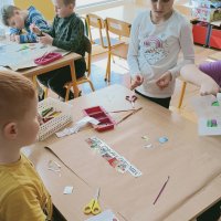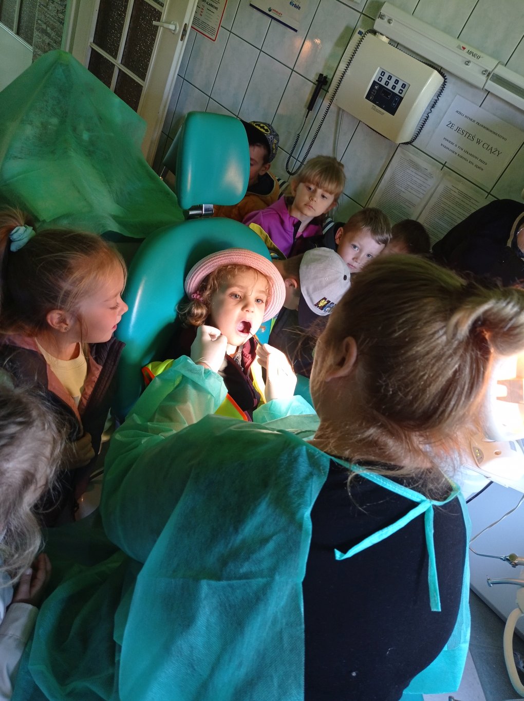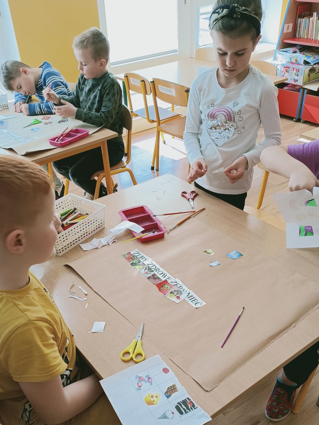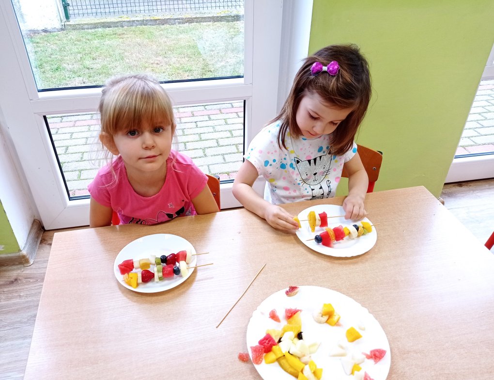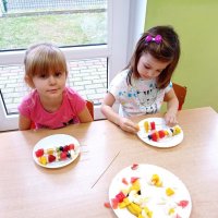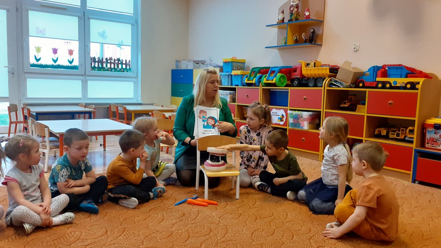 Podczas realizacji pierwszego tematu: „Zdrowe ząbki i piękny uśmiech” dzieci poznały model ludzkiej szczęki oraz przypomniały sobie i utrwaliły zasady prawidłowego szczotkowania ząbków. Rozmawiały o przyborach higienicznych, kolorowały obrazek zdrowego ząbka, wysłuchały opowiadania pt. „Benio u dentysty” i rozmawiały na jego temat. Realizując drugi temat: „Co lubią gryźć zdrowe ząbki?” skupiliśmy się na utrwaleniu umiejętności odróżniania produktów żywnościowych mających korzystny wpływ na nasze zęby i zdrowie, od produktów, które naszemu zdrowiu szkodzą i powodują próchnicę. Dzieci podczas śniadania w stylu tzw. „szwedzkiego stołu” same robiły sobie kanapki wybierając z tacy najzdrowsze smakołyki. Dowiedziały się też m.in., dlaczego należy chrupać marchewkę. Grupa 4- latków przygotowała kolorowe owocowe szaszłyki, które szybko zniknęły z talerzyków. Realizując trzeci temat: „Wizyta u stomatologa to fajna przygoda” grupa „Misie” odwiedziła miejscowy gabinet stomatologiczny. Dzieci poznały stomatolog Panią Edytę Wilk, która opowiedziała im o swojej pracy oraz zapoznała z gabinetem i narzędziami stomatologicznymi. Chętne dzieci usiadły na fotelu dentystycznym, a pani Edyta sprawdziła stan ich ząbków. Wiele dzieci dzięki temu spotkaniu przełamało swój strach przed wizytą u stomatologa. Podczas zajęć z czwartego tematu: „Pamiętaj o myciu ząbków!” dzieci utrwaliły nawyk mycia zębów, bawiły się przy piosence „Szczotka, pasta, kubek, ciepła woda…”, obejrzały bajkę pt. „Dr Ząbek i legenda Zębolandii”, wykonały pracę plastyczną „LOGO – mój kubek do mycia zębów ”.