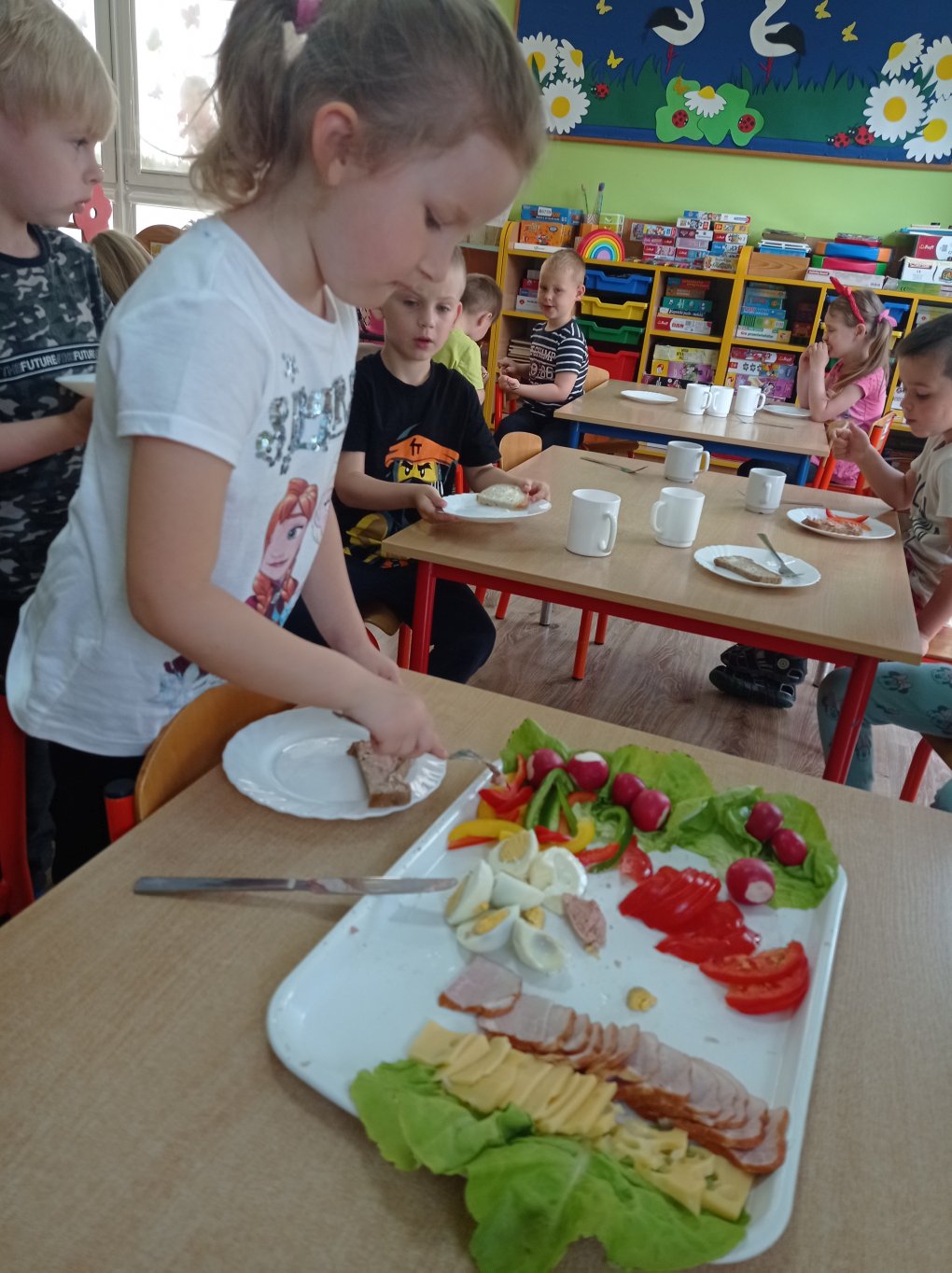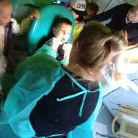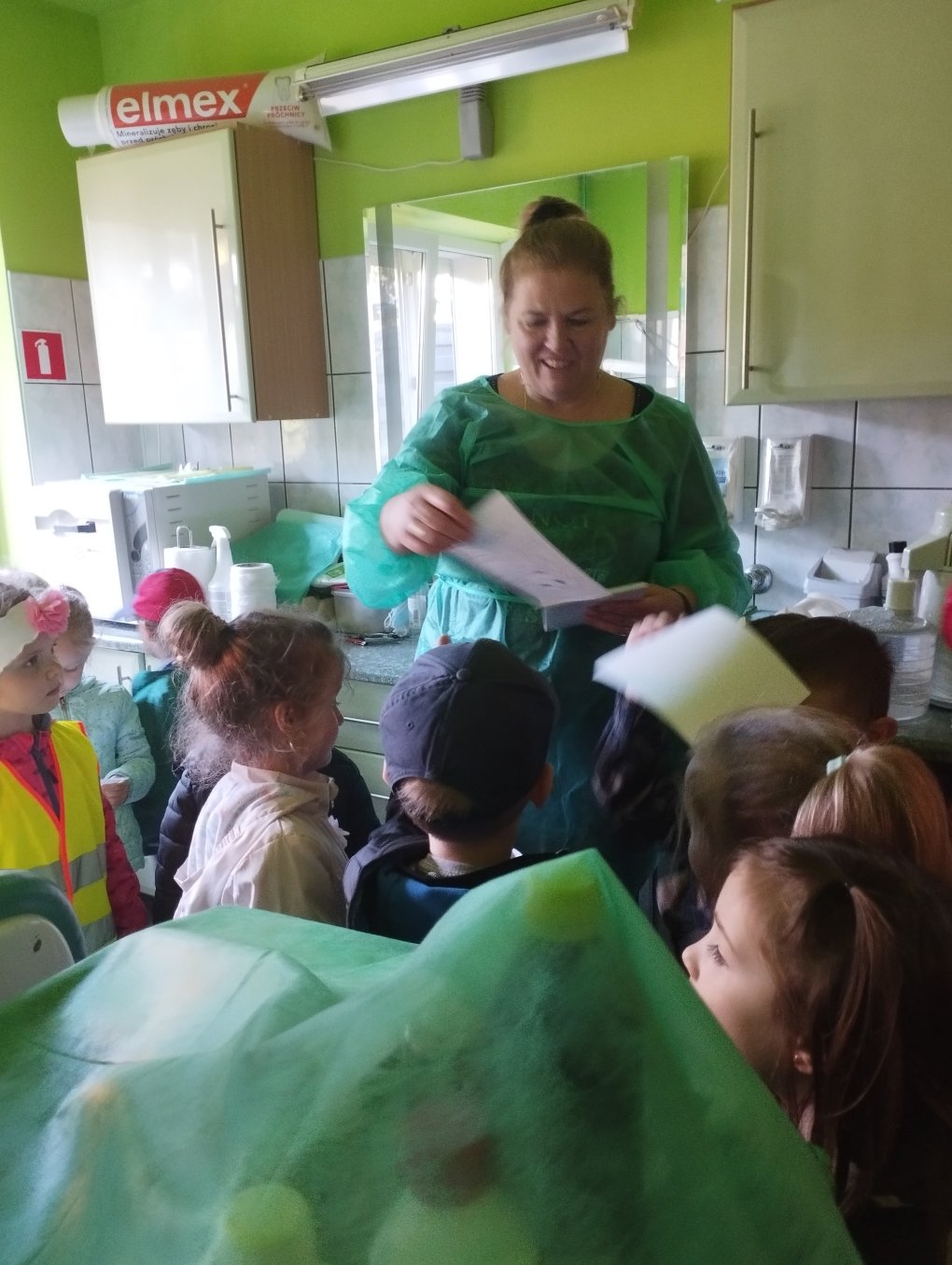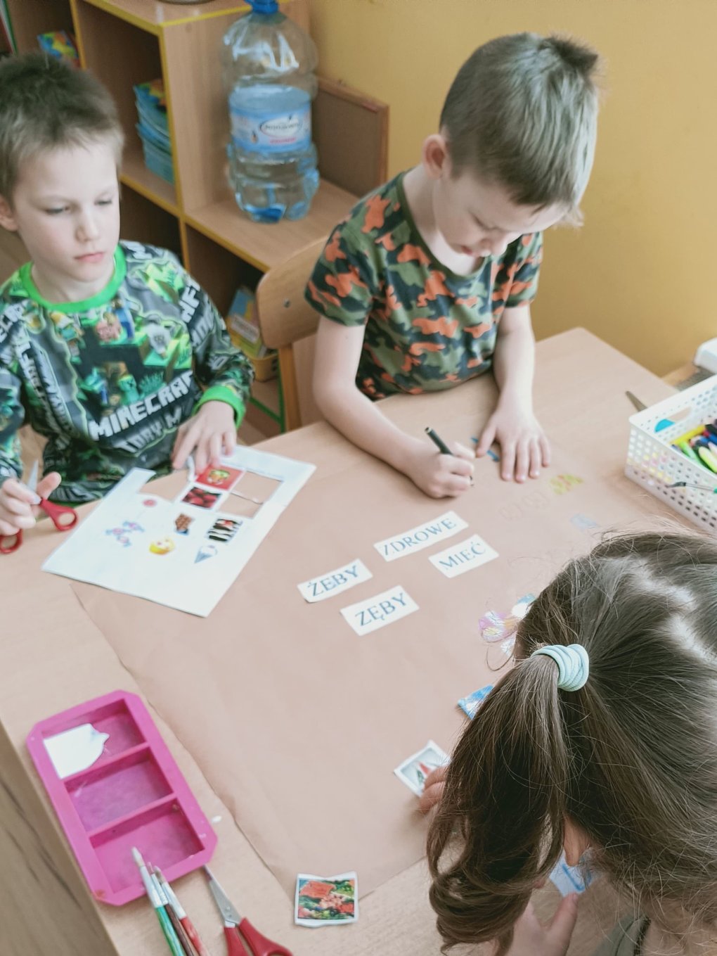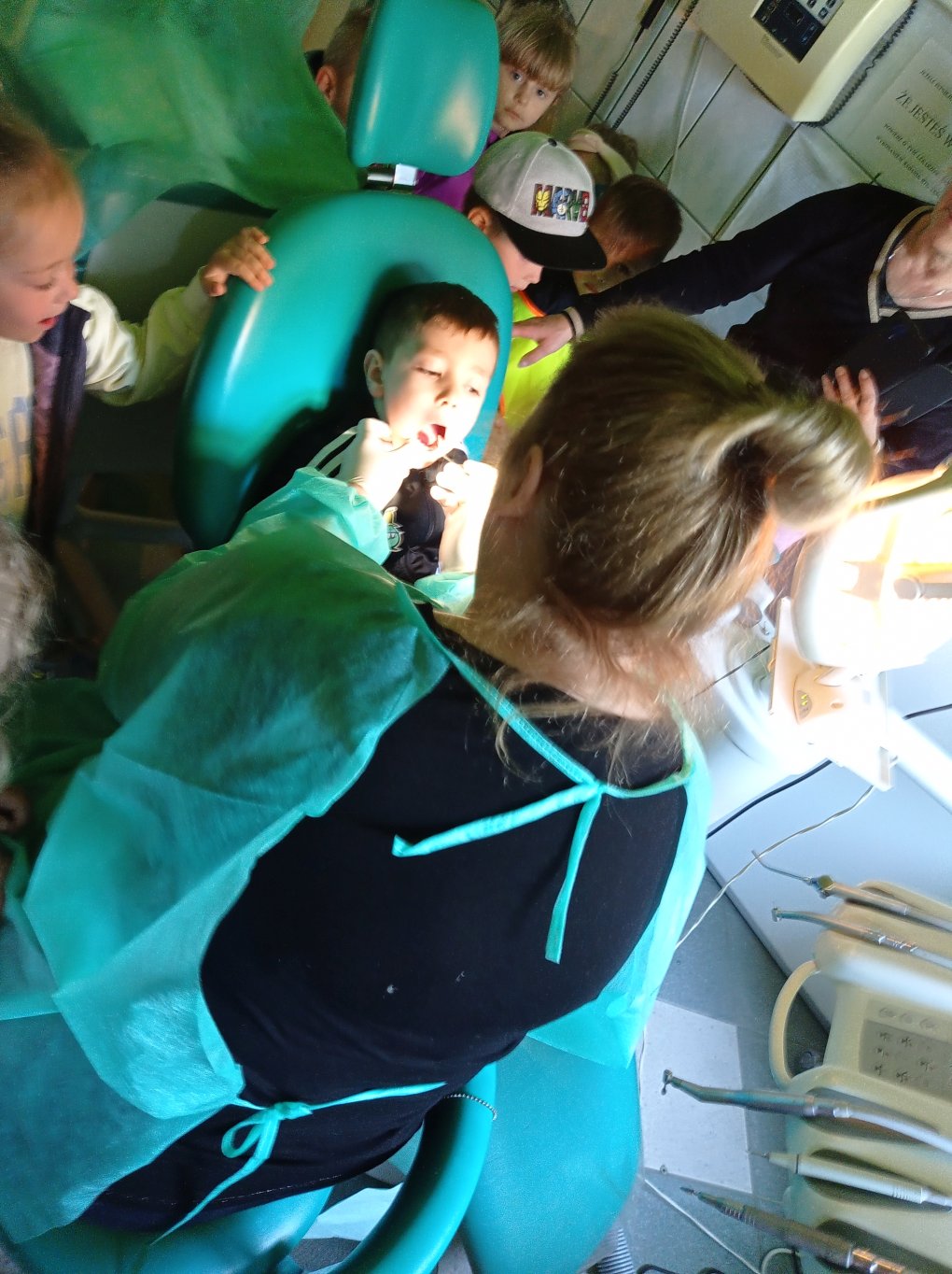 Podczas realizacji pierwszego tematu: „Zdrowe ząbki i piękny uśmiech” dzieci poznały model ludzkiej szczęki oraz przypomniały sobie i utrwaliły zasady prawidłowego szczotkowania ząbków. Rozmawiały o przyborach higienicznych, kolorowały obrazek zdrowego ząbka, wysłuchały opowiadania pt. „Benio u dentysty” i rozmawiały na jego temat. Realizując drugi temat: „Co lubią gryźć zdrowe ząbki?” skupiliśmy się na utrwaleniu umiejętności odróżniania produktów żywnościowych mających korzystny wpływ na nasze zęby i zdrowie, od produktów, które naszemu zdrowiu szkodzą i powodują próchnicę. Dzieci podczas śniadania w stylu tzw. „szwedzkiego stołu” same robiły sobie kanapki wybierając z tacy najzdrowsze smakołyki. Dowiedziały się też m.in., dlaczego należy chrupać marchewkę. Grupa 4- latków przygotowała kolorowe owocowe szaszłyki, które szybko zniknęły z talerzyków. Realizując trzeci temat: „Wizyta u stomatologa to fajna przygoda” grupa „Misie” odwiedziła miejscowy gabinet stomatologiczny. Dzieci poznały stomatolog Panią Edytę Wilk, która opowiedziała im o swojej pracy oraz zapoznała z gabinetem i narzędziami stomatologicznymi. Chętne dzieci usiadły na fotelu dentystycznym, a pani Edyta sprawdziła stan ich ząbków. Wiele dzieci dzięki temu spotkaniu przełamało swój strach przed wizytą u stomatologa. Podczas zajęć z czwartego tematu: „Pamiętaj o myciu ząbków!” dzieci utrwaliły nawyk mycia zębów, bawiły się przy piosence „Szczotka, pasta, kubek, ciepła woda…”, obejrzały bajkę pt. „Dr Ząbek i legenda Zębolandii”, wykonały pracę plastyczną „LOGO – mój kubek do mycia zębów ”.