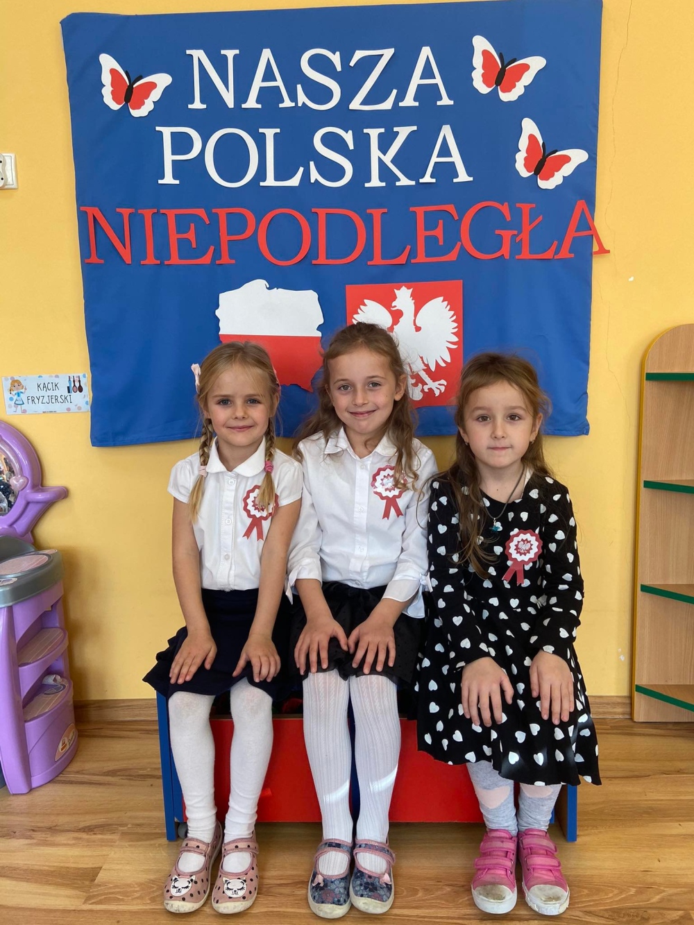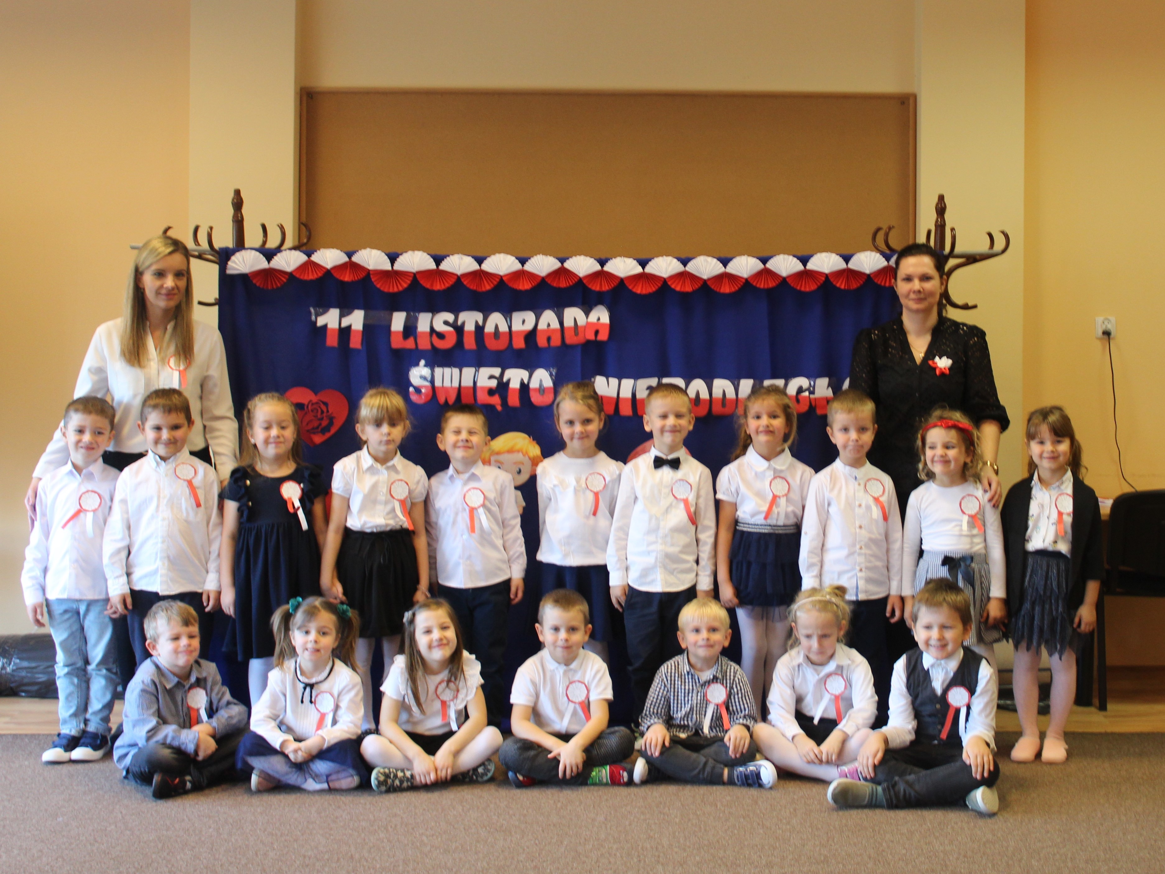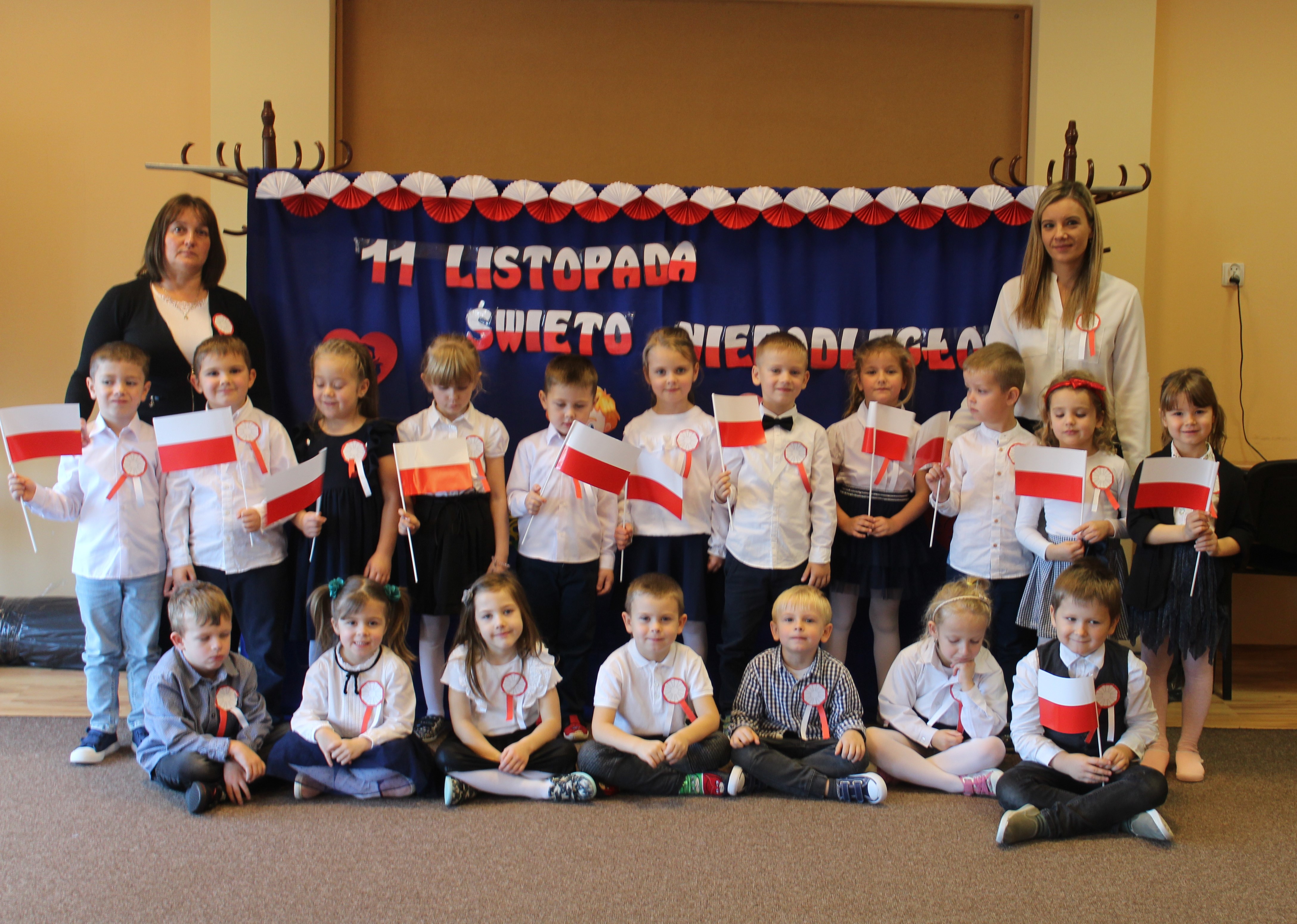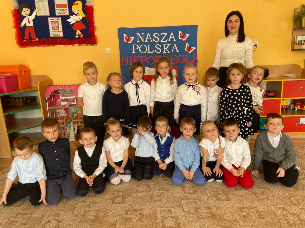 Uczciliśmy w naszym przedszkolu tradycyjnie. Było wspólne odśpiewanie hymnu państwowego oraz prezentacje artystyczne przygotowane przez wszystkie grupy specjalnie na tę okoliczność. Wcześniej dzieci wykonywały prace plastyczne, które ozdobiły kąciki wystaw na biało i czerwono.