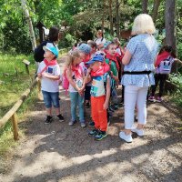 Po ciekawych zajęciach czekała na przedszkolaki pani przewodnik, która poprowadziła je leśną ścieżką edukacyjną, na której znajduje się czterdzieści modeli prehistorycznych gadów naturalnej wielkości!