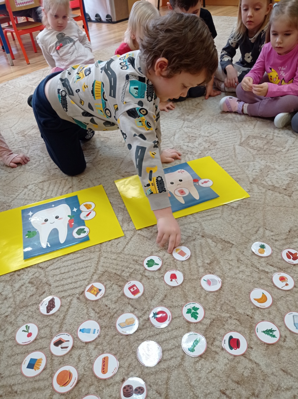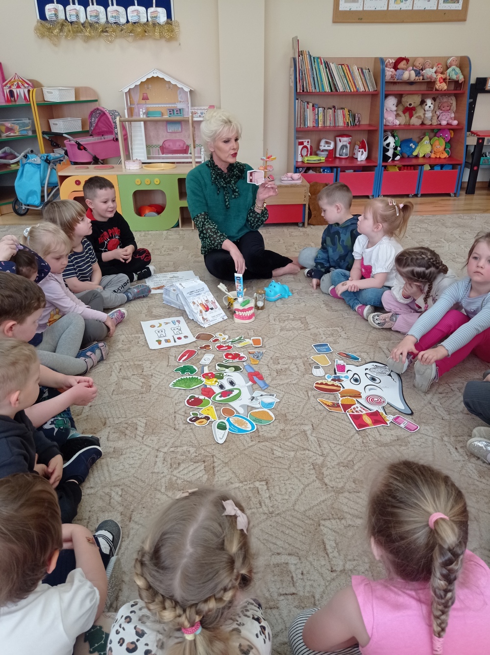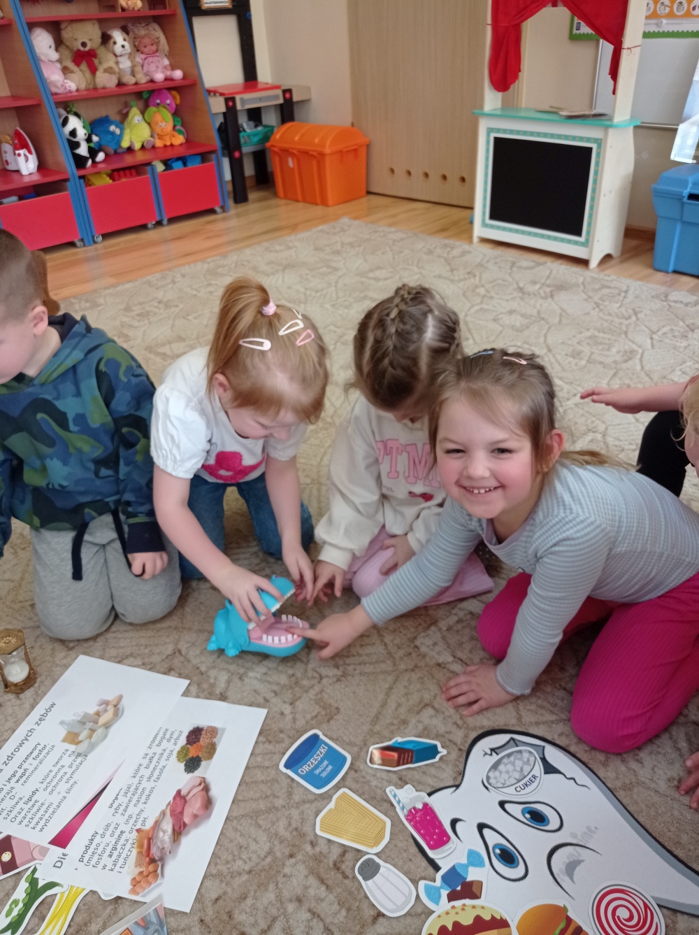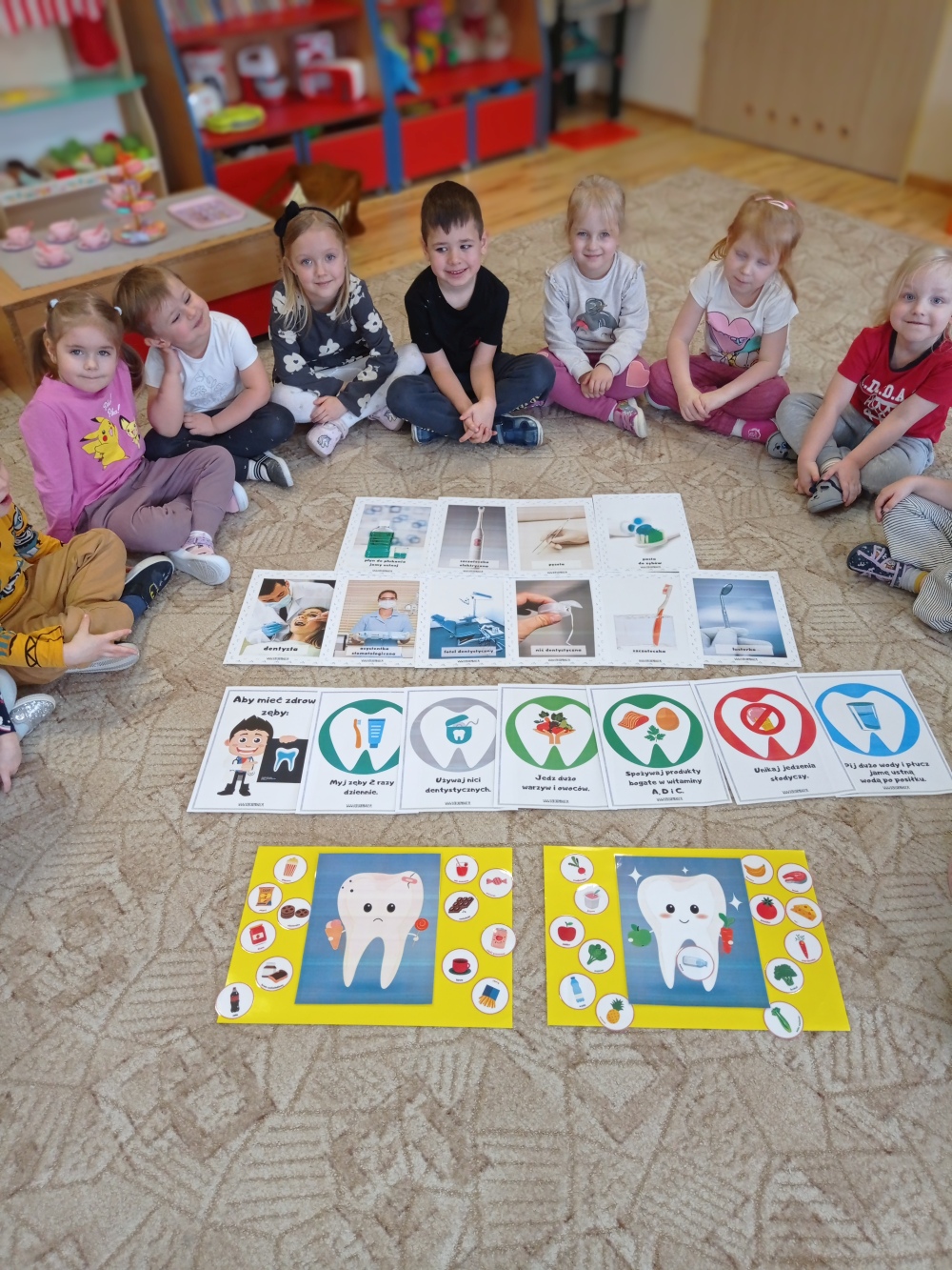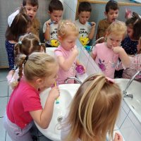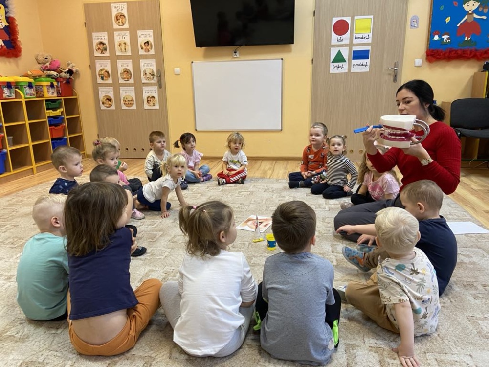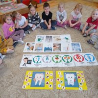 Podczas zajęć dzieci nauczyły się prawidłowo szczotkować zęby, nakładać odpowiednią ilość pasty oraz dbać o swoje przybory higieniczne. Dowiedziały się co jest dobre dla ich zębów, a co im szkodzi. Wykonały piękne prace plastyczne i opaski na głowy oraz wzięły udział w zabawach związanych z tematem. Wysłuchały opowiadania z prozdrowotnym morałem i chętnie podsumowały zdobytą wiedzę z panią Renatą Boczek z Powiatowej Stacji Sanitarno- Epidemiologicznej w Choszcznie.