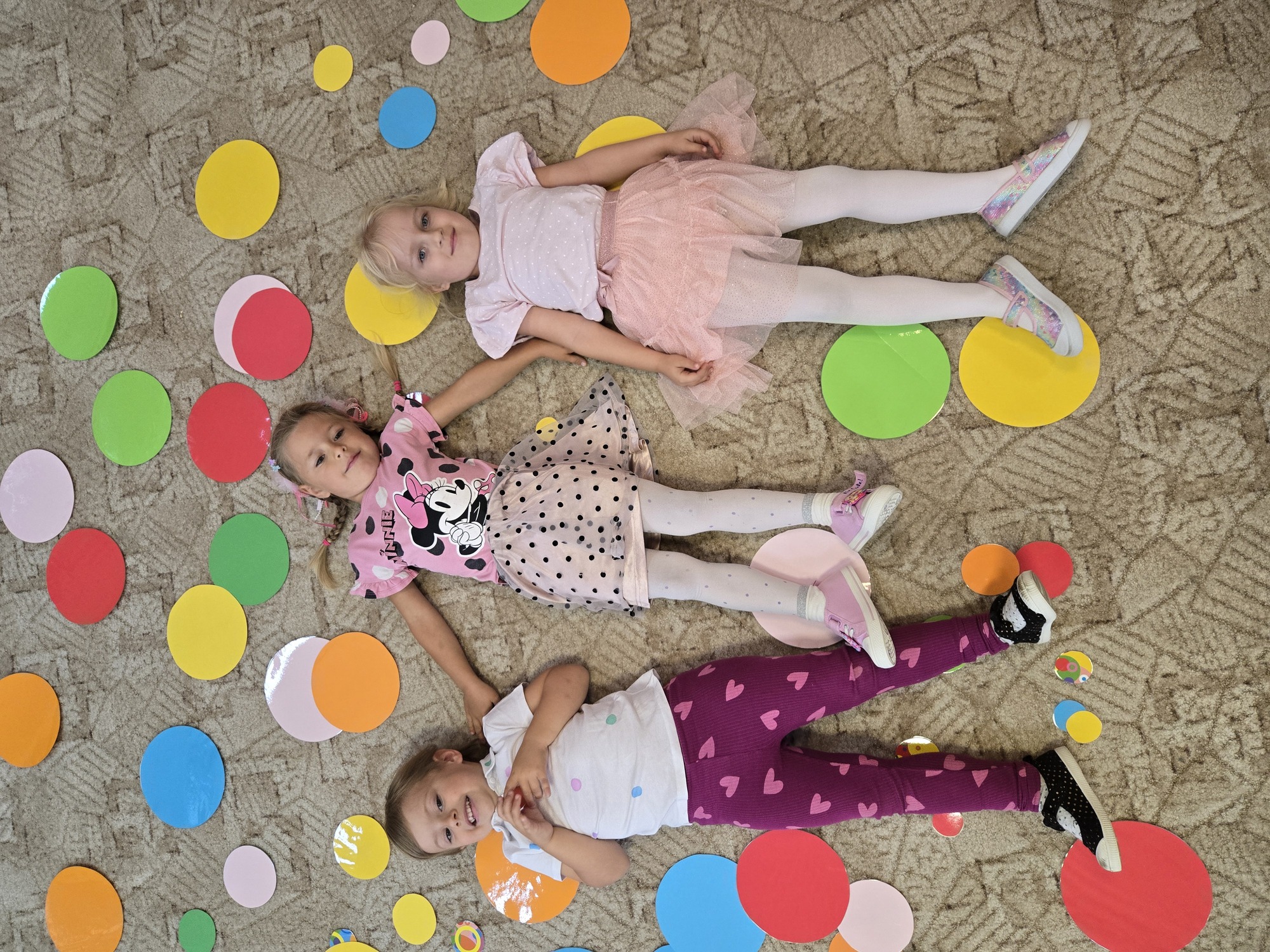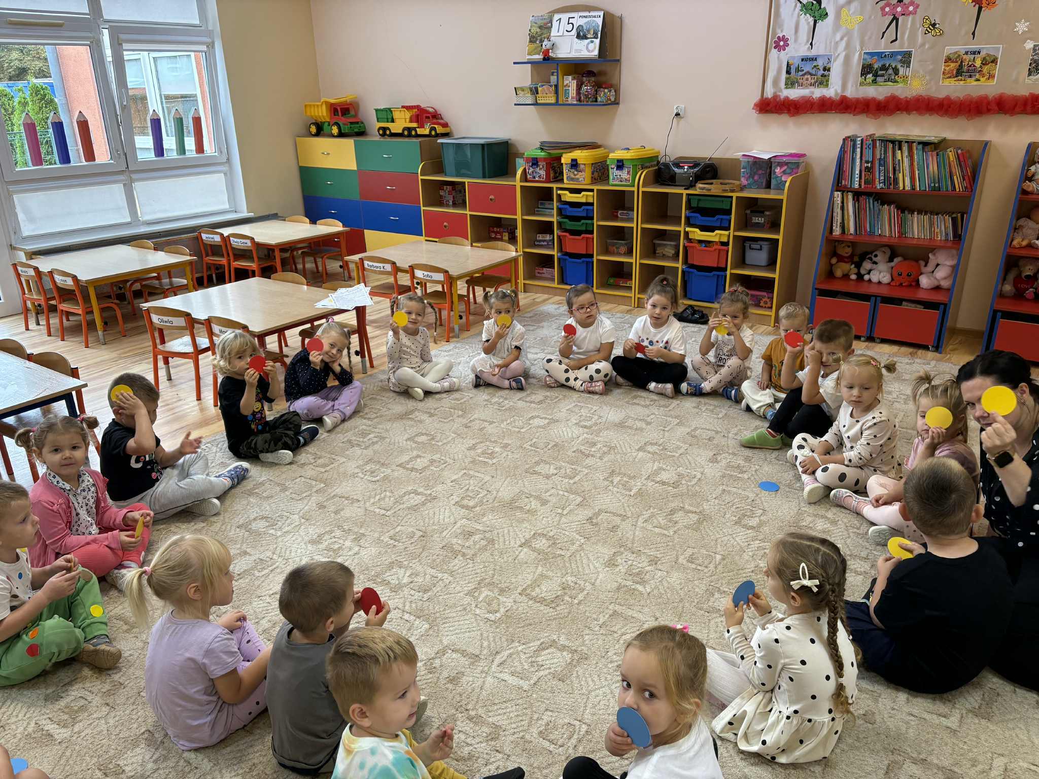 Na sali pojawiły się kolorowe koła po których dzieci skakały i tańczyły.