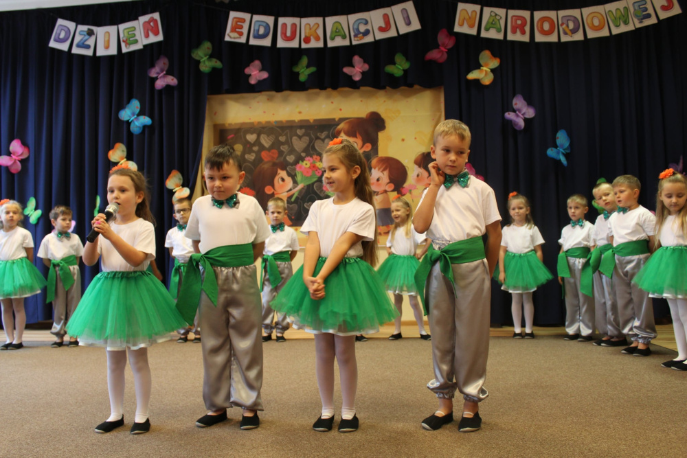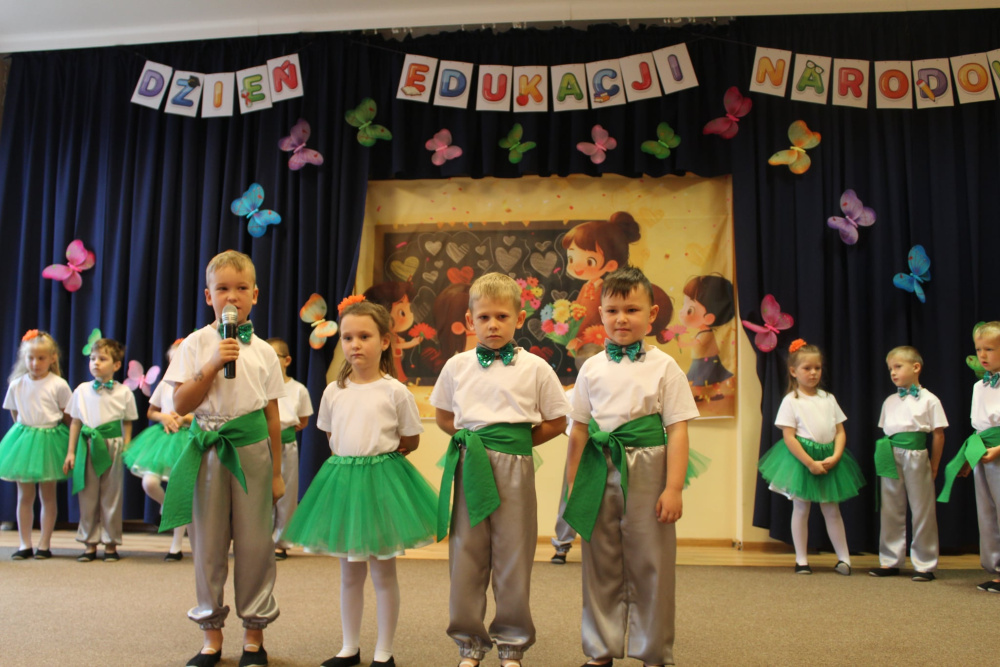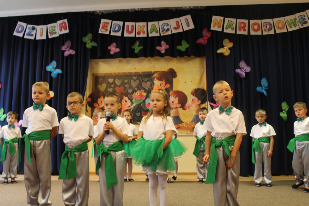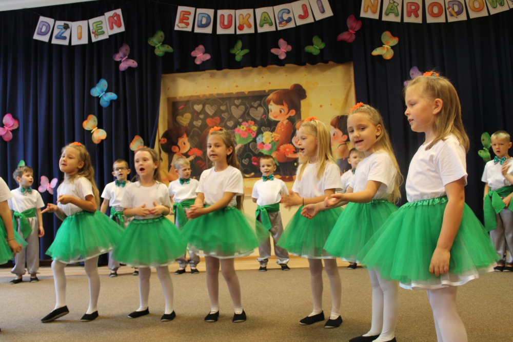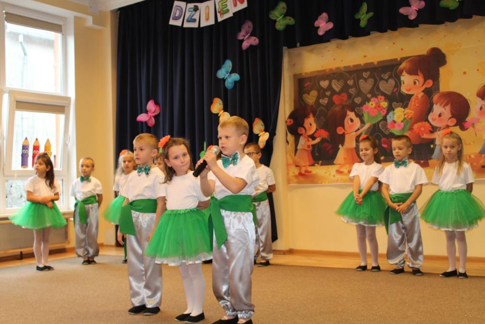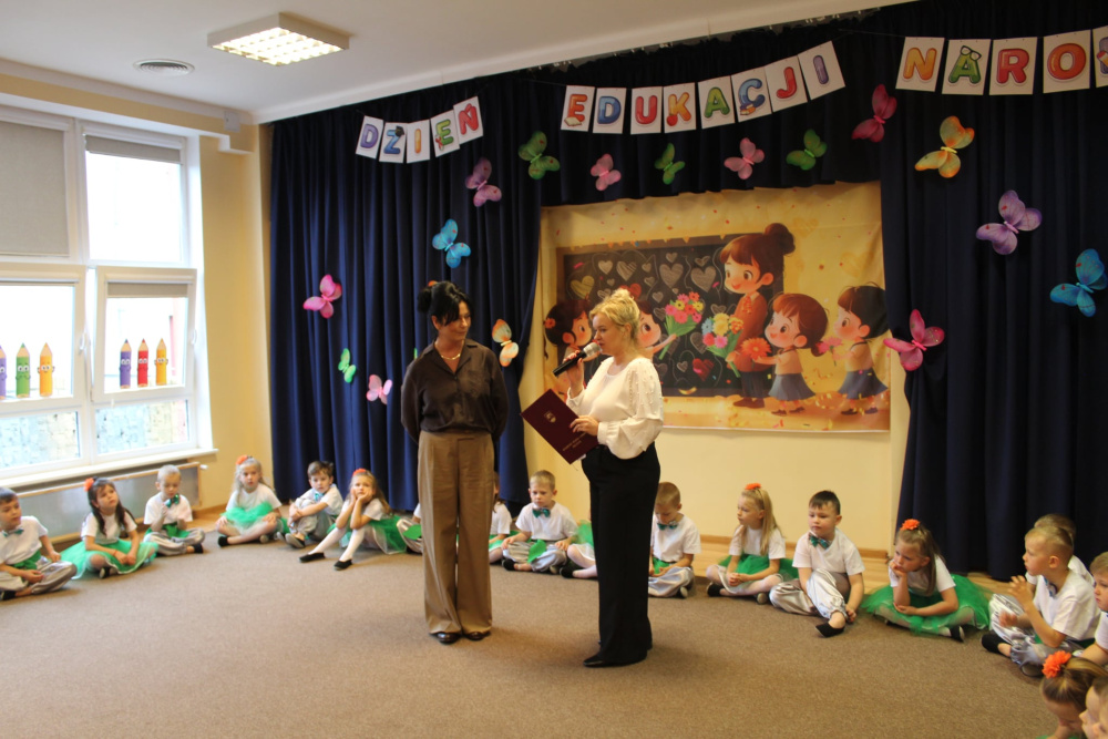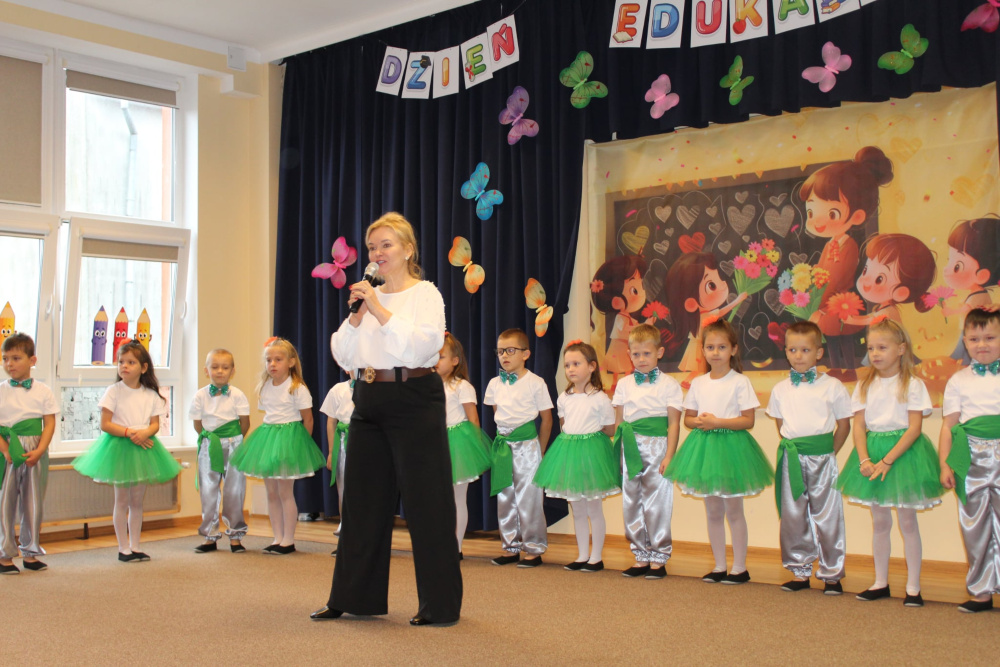 Z tej okazji dzieci z grupy „ Żabki” przygotowały dla wszystkich gości piękny występ artystyczny. Były wiersze, piosenki i tańce – wszystko pełne radości, uśmiechów i szczerych życzeń. Przedszkolaki bardzo się starały, a ich występ został nagrodzony gromkimi brawami.Po części artystycznej nastąpiło wręczenie kwiatów i drobnych upominków pracownikom przedszkola. Nie zabrakło również życzeń, uśmiechów i słodkiego poczęstunku, który przygotowali nasi drodzy rodzice, za co bardzo serdecznie dziękujemy. Tegoroczny Dzień Edukacji Narodowej był pełen wzruszeń i radości. Uroczystość stała się okazją do podkreślenia, jak ważna i odpowiedzialna jest praca nauczyciela oraz jak wiele serca wkładają pracownicy przedszkola w wychowanie najmłodszych.
