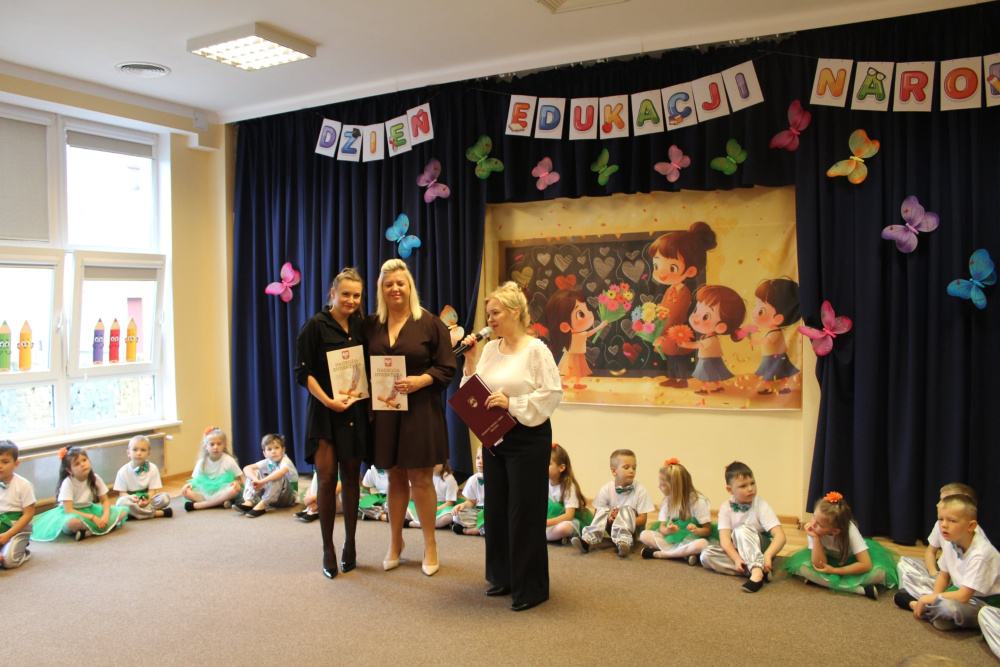 Uroczystość rozpoczęła się od serdecznego powitania gości przez dyrektora przedszkola Panią Marzennę Dziekońską, która to podziękowała całemu gronu pedagogicznemu oraz pracownikom obsługi za ich codzienny trud, zaangażowanie i troskę o wychowanie oraz rozwój dzieci. Był to też moment, aby wręczyć nagrody i wyróżnienia pracownikom, którzy w szczególny sposób przyczynili się do rozwoju i sukcesów naszego przedszkola.