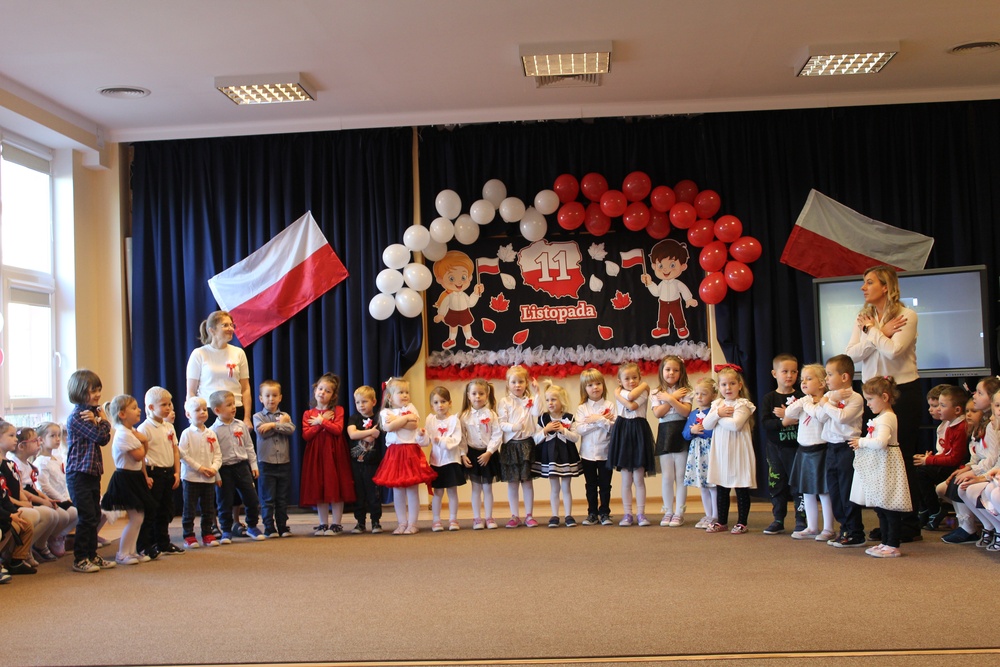 Uroczystość rozpoczęła się od wspólnego odśpiewania hymnu narodowego. Dzieci z dumą i powagą zaśpiewały „Mazurka Dąbrowskiego”, trzymając w rękach biało-czerwone chorągiewki. Następnie przedszkolaki zaprezentowały wiersze i piosenki patriotyczne specjalnie przygotowane na tę okazję.