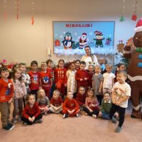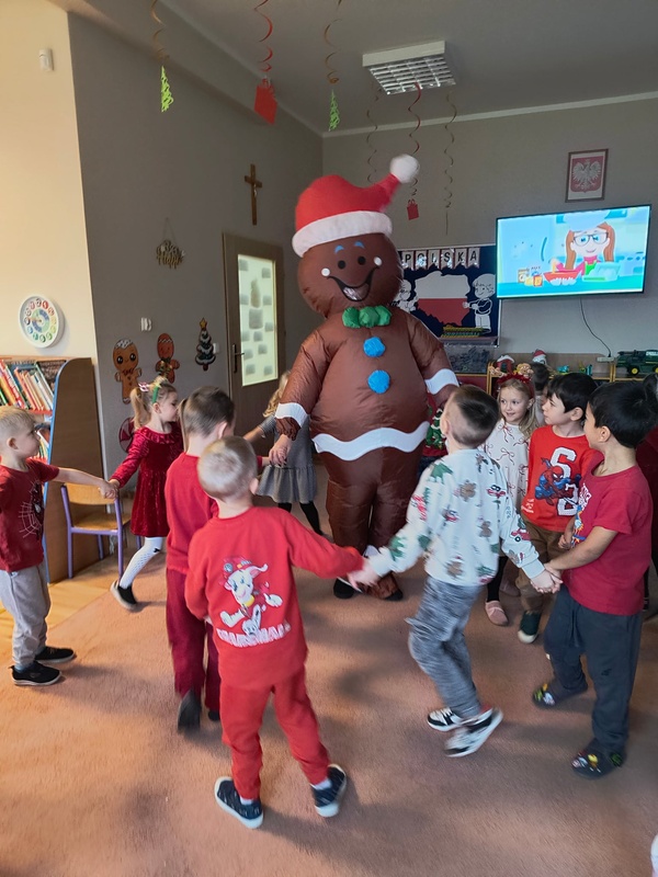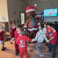 Dzieci z ogromnym zaangażowaniem wałkowały ciasto, wykrawały foremkami świąteczne kształty. Po wystudzeniu nadszedł najbardziej wyczekiwany moment – dekorowanie. Kolorowe lukry, posypki i czekoladowe ozdoby pobudziły dziecięcą wyobraźnię, a każdy piernik stał się małym dziełem sztuki. Zajęcia przebiegały w miłej, świątecznej atmosferze, sprzyjały współpracy, rozwijały zdolności manualne i sprawiły Pszczółkom ogromną radość. Zapach pierników na długo pozostał w sali, przypominając o wspólnie spędzonym, wyjątkowym czasie. Na zakończenie tego wyjątkowego dnia dzieci spotkała miła niespodzianka – odwiedził je piernikowy ludzik. Wzbudził on ogromną radość i entuzjazm wśród Pszczółek. Razem z dziećmi tańczył przy wesołej muzyce, zachęcając wszystkich do wspólnej zabawy. Śmiech, radosne okrzyki i taneczne pląsy sprawiły, że to spotkanie stało się pięknym zwieńczeniem piernikowych zajęć i na długo pozostanie w pamięci dzieci.