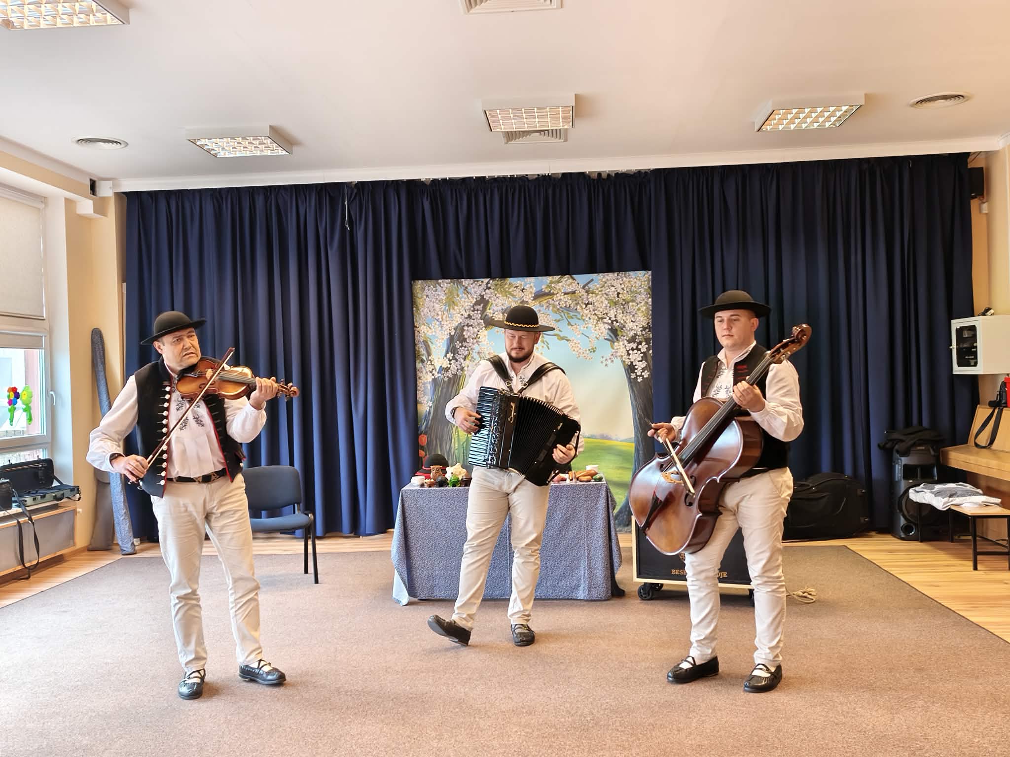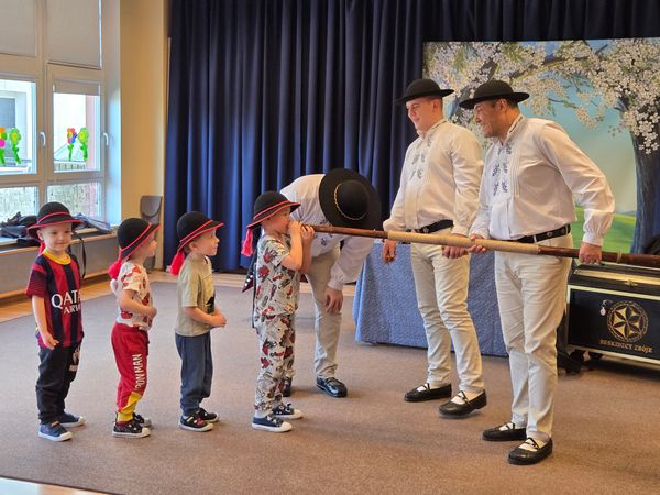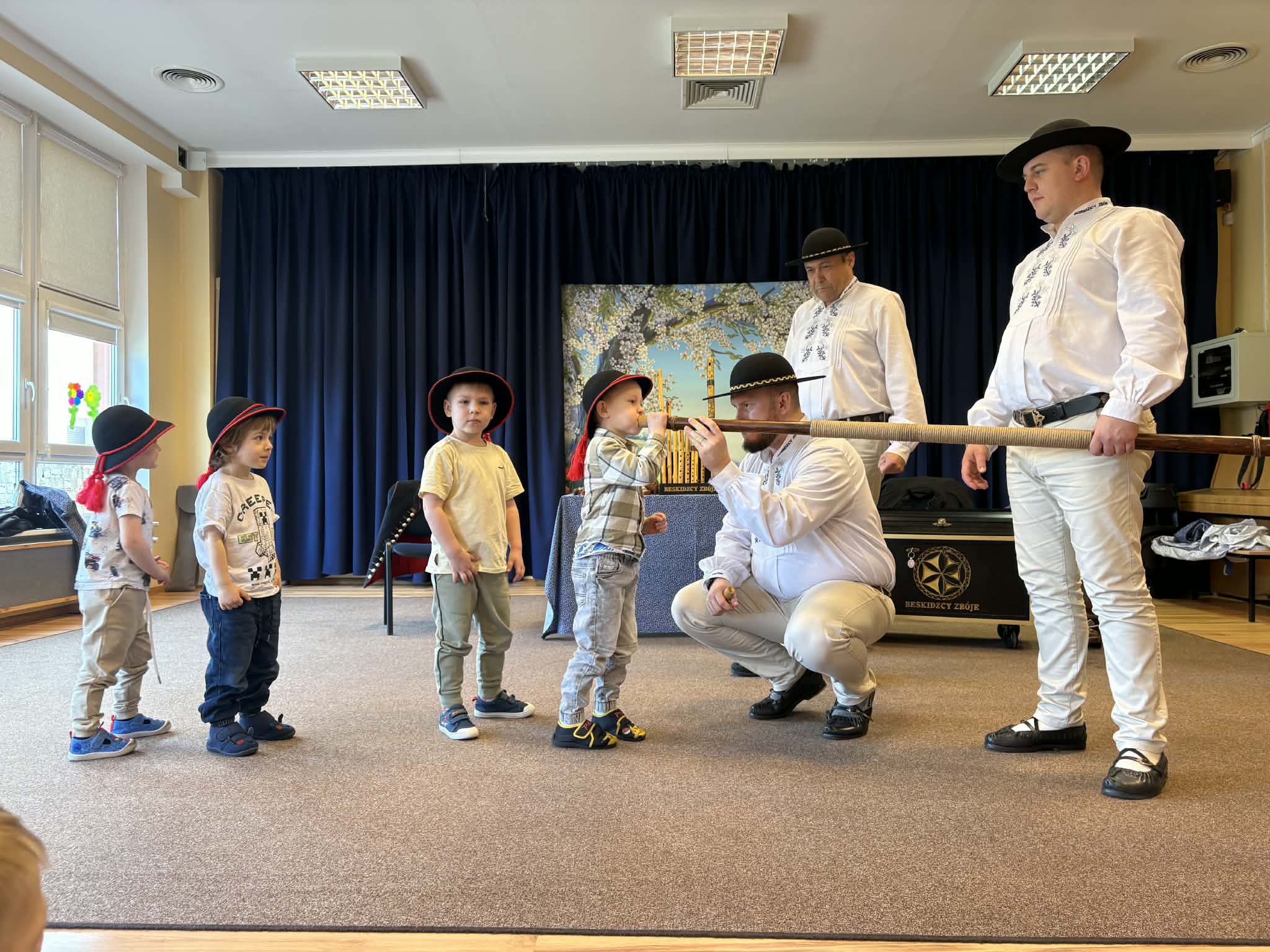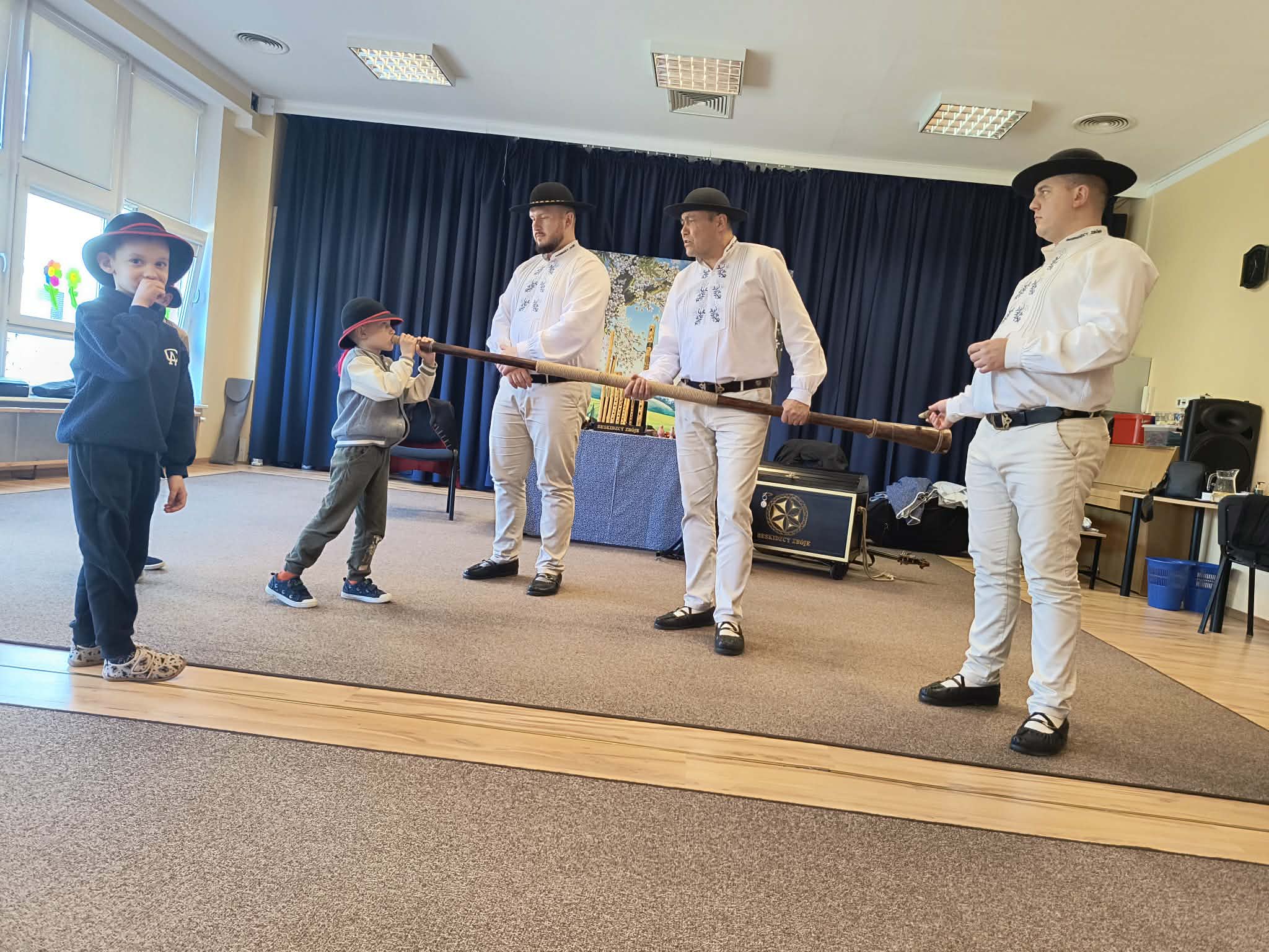 Dzieci uczestniczyły w wyjątkowym spotkaniu z góralską kapelą, podczas którego miały okazję poznać tradycyjne instrumenty ludowe oraz kulturę góralską. Muzycy zaprezentowali różnorodne instrumenty, takie jak drewniane fujarki, gliniane okaryny, długie trombity oraz małe gliniane ptaszki wydające dźwięki przypominające śpiew ptaków.