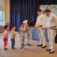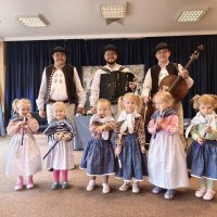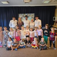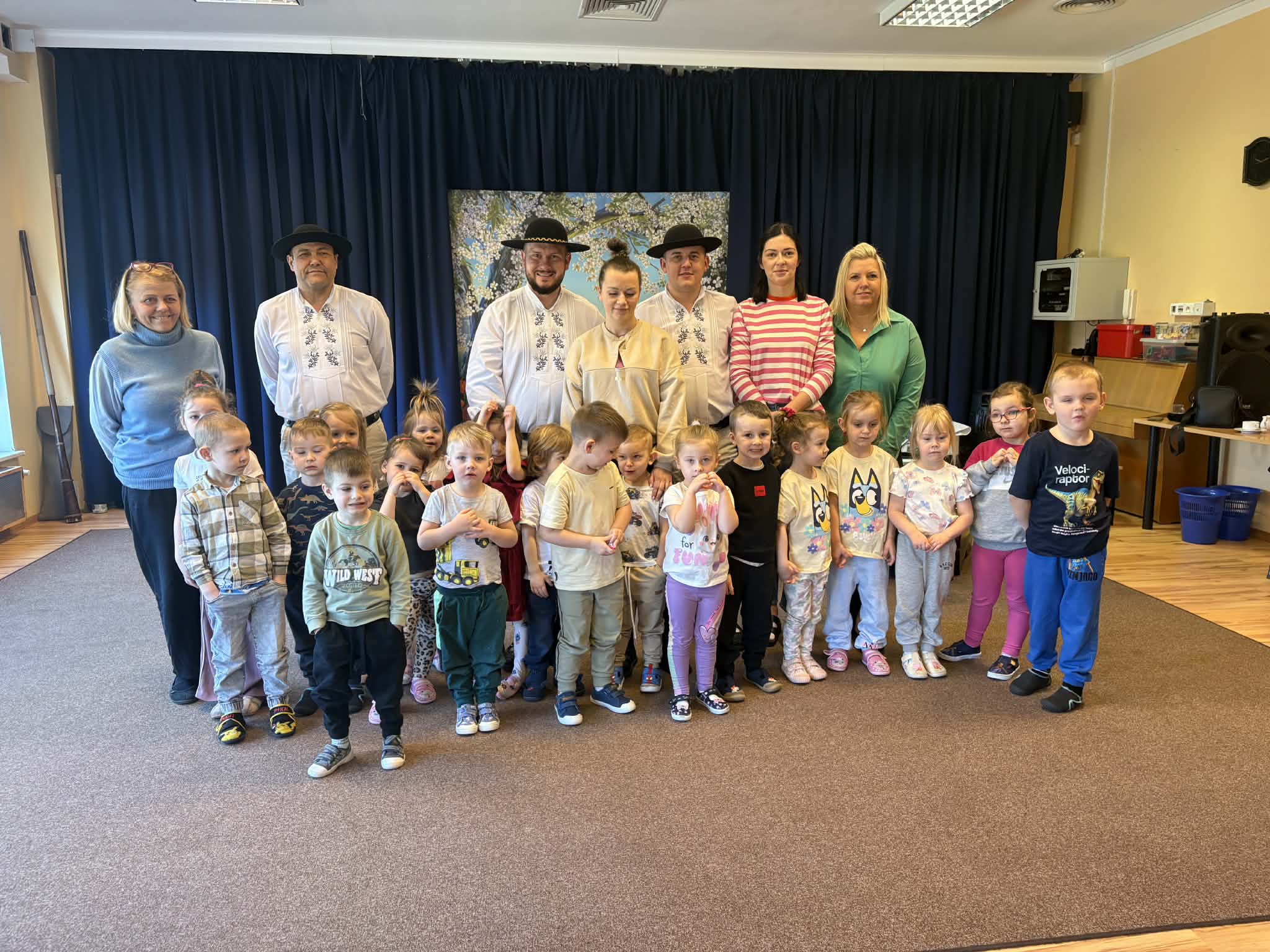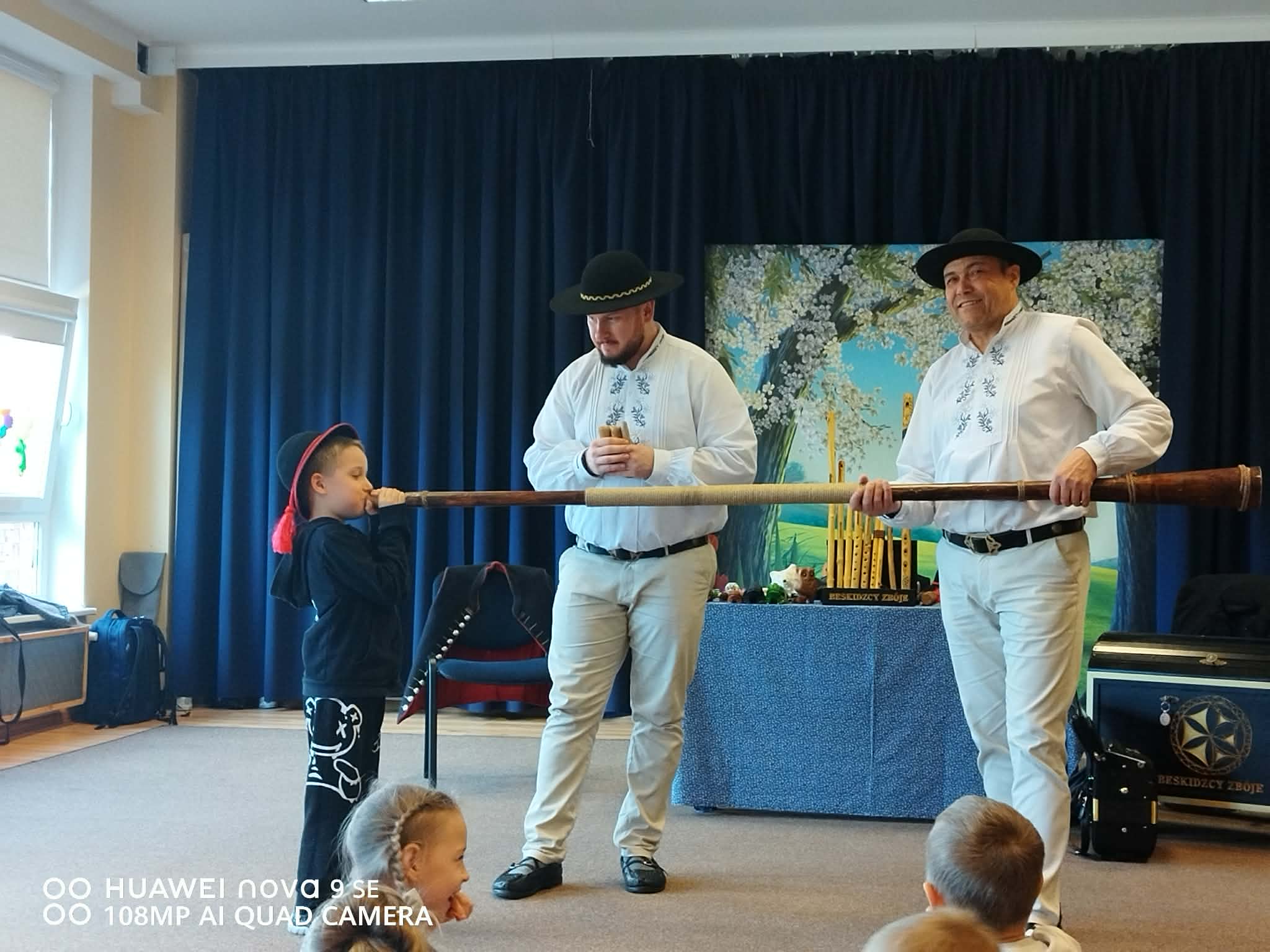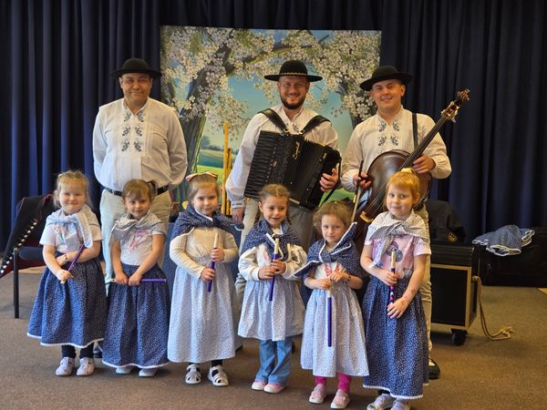 Dzieci uczestniczyły w wyjątkowym spotkaniu z góralską kapelą, podczas którego miały okazję poznać tradycyjne instrumenty ludowe oraz kulturę góralską. Muzycy zaprezentowali różnorodne instrumenty, takie jak drewniane fujarki, gliniane okaryny, długie trombity oraz małe gliniane ptaszki wydające dźwięki przypominające śpiew ptaków.