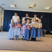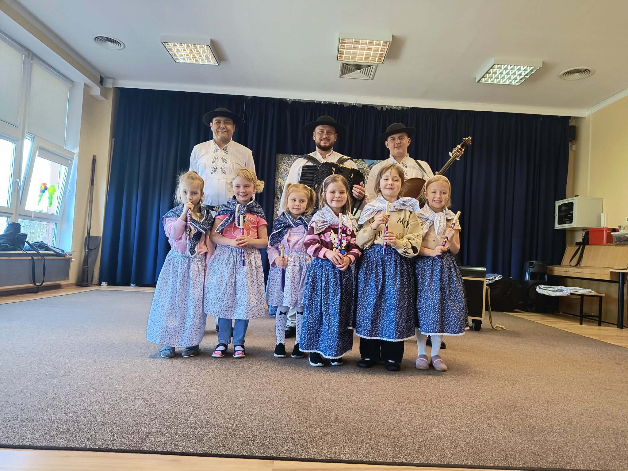 Spotkanie przebiegało w radosnej atmosferze, pełnej muzyki, śmiechu i wspólnej zabawy. Było to nie tylko ciekawe doświadczenie artystyczne, ale także wartościowa lekcja kultury ludowej, która na długo pozostanie w pamięci dzieci.