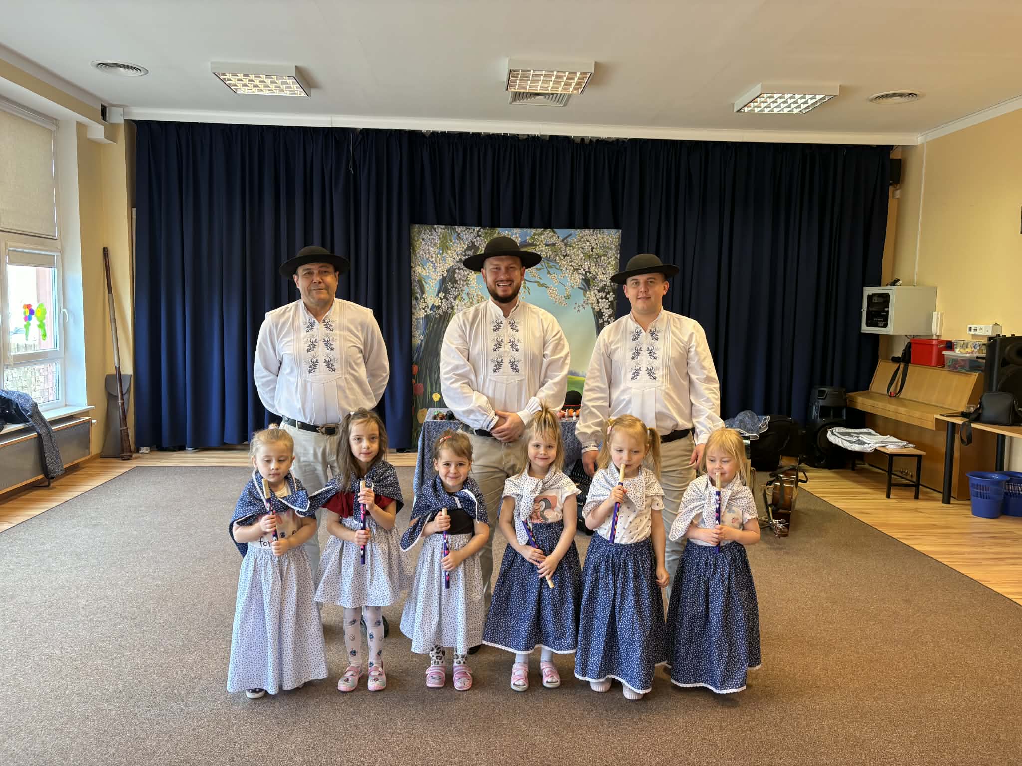 Szczególną atrakcją było aktywne włączenie dzieci do zabawy. Dziewczynki zostały przebrane w tradycyjne stroje góralskie, co sprawiło im wiele radości i pozwoliło poczuć się jak prawdziwe góralki. Następnie miały możliwość spróbowania gry na fujarkach, co było dla nich niezwykłym doświadczeniem muzycznym.