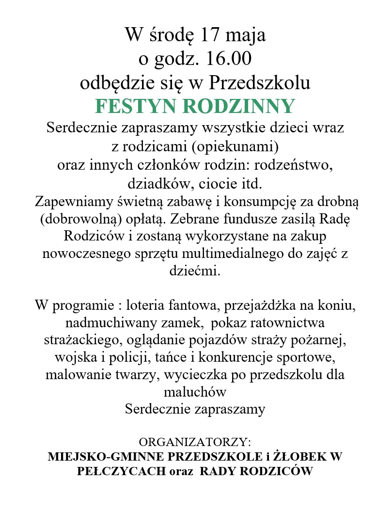 17 maja 2023 r. w Miejsko-Gminnym Przedszkolu w Pełczycach odbył się Festyn Rodzinny zorganizowany wspólnie przez Przedszkole, Żłobek i Rady Rodziców obu tych instytucji.